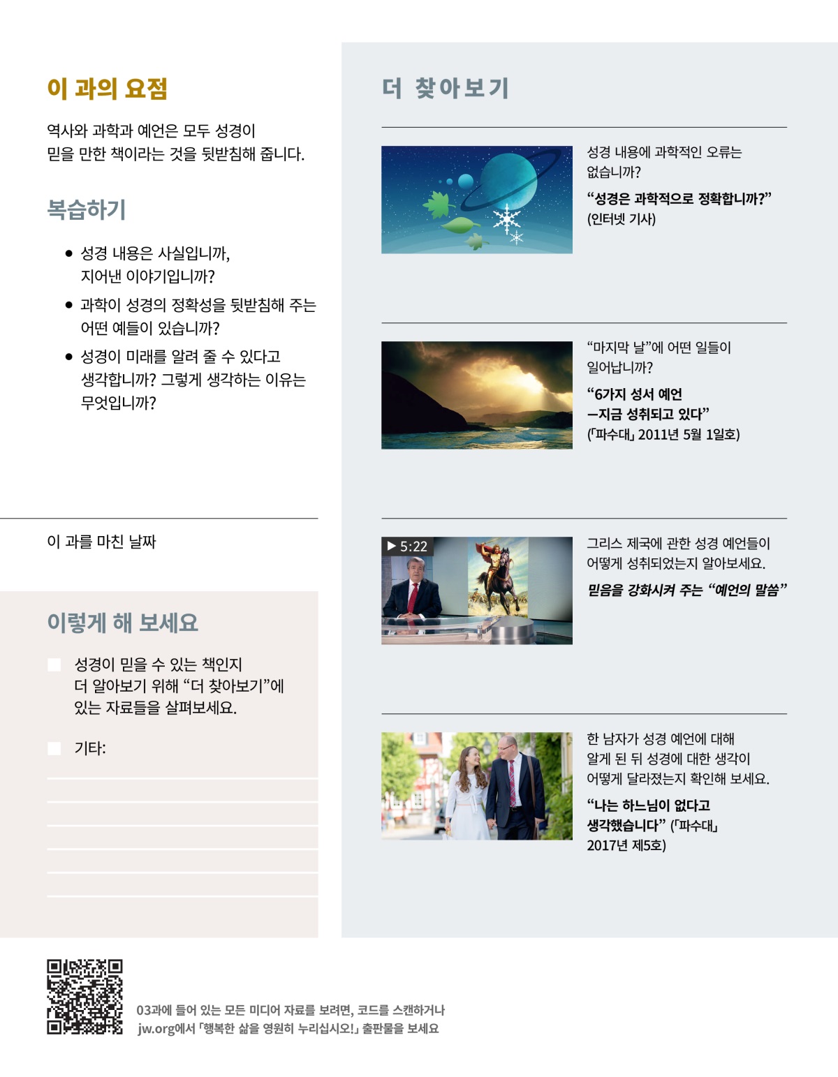 성경에는 “아직 이루어지지 않은 일들”을 미리 알려 주는 예언a들이 들어 있습니다. (이사야 46:10) 성경은 많은 역사적인 사건을 그 일이 일어나기 오래 전에 정확하게 예언했습니다. 또한 성경은 오늘날의 세상 상태를 놀랄 만큼 구체적으로 예언했습니다. 이 과에서는 성경 예언 몇 가지를 살펴볼 것입니다. 그 예언들은 매우 정확하게 성취되었습니다!