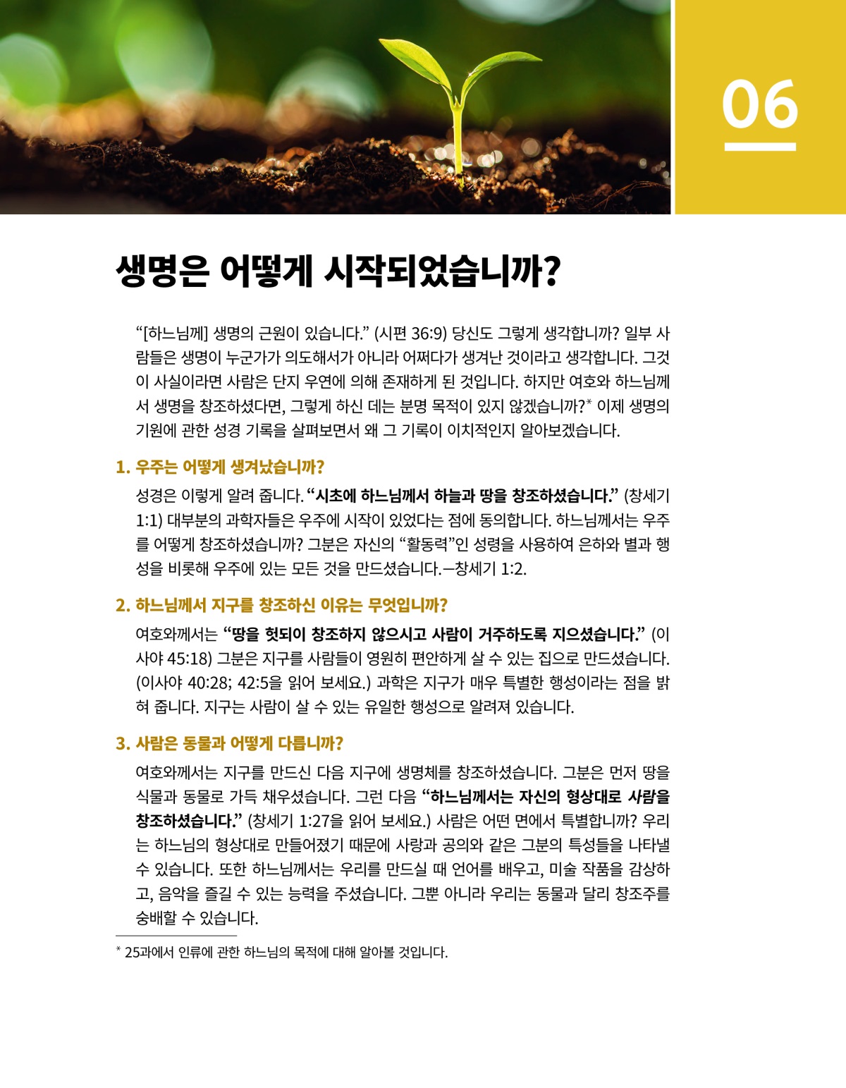 “[하느님께] 생명의 근원이 있습니다.” (시편 36:9) 당신도 그렇게 생각합니까? 일부 사람들은 생명이 누군가가 의도해서가 아니라 어쩌다가 생겨난 것이라고 생각합니다. 그것이 사실이라면 사람은 단지 우연에 의해 존재하게 된 것입니다. 하지만 여호와 하느님께서 생명을 창조하셨다면, 그렇게 하신 데는 분명 목적이 있지 않겠습니까?a 이제 생명의 기원에 관한 성경 기록을 살펴보면서 왜 그 기록이 이치적인지 알아보겠습니다.