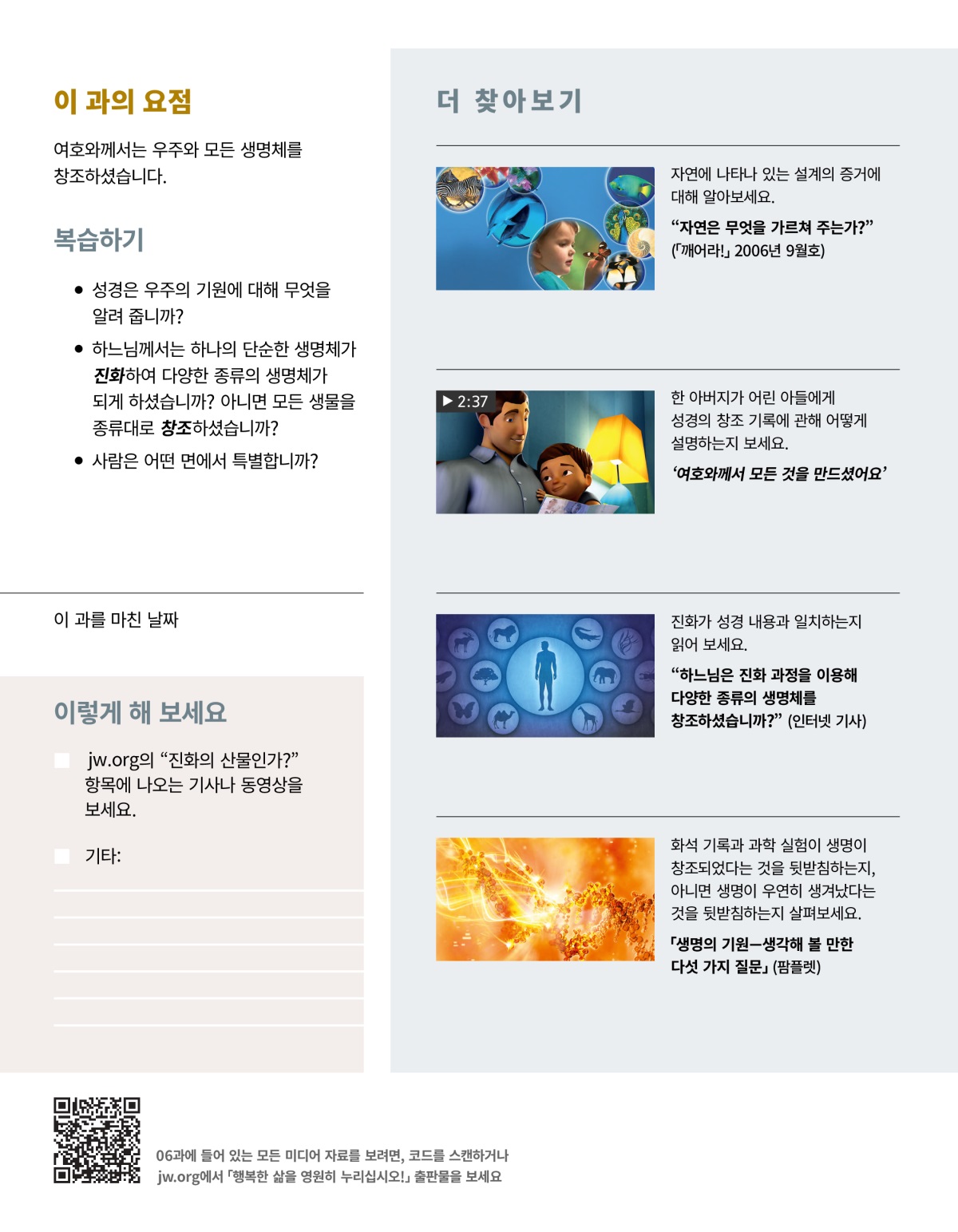 일부 사람들은 하느님께서 진화 과정을 이용해 생명체들을 창조하셨다고 생각합니다. 창세기 1:21, 25, 27을 읽고 다음의 질문에 대답해 보세요.