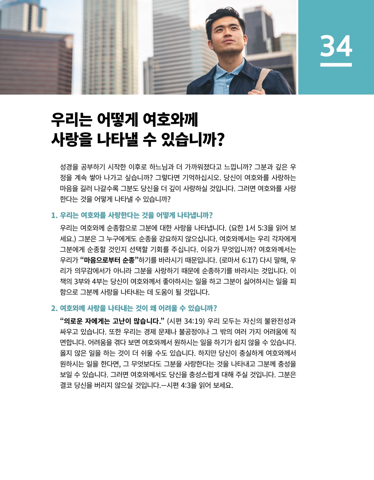 우리는 여호와께 순종함으로 그분에 대한 사랑을 나타냅니다. (요한 1서 5:3을 읽어 보세요.) 그분은 그 누구에게도 순종을 강요하지 않으십니다. 여호와께서는 우리 각자에게 그분에게 순종할 것인지 선택할 기회를 주십니다. 이유가 무엇입니까? 여호와께서는 우리가 “마음으로부터 순종”하기를 바라시기 때문입니다. (로마서 6:17) 다시 말해, 우리가 의무감에서가 아니라 그분을 사랑하기 때문에 순종하기를 바라시는 것입니다. 이 책의 3부와 4부는 당신이 여호와께서 좋아하시는 일을 하고 그분이 싫어하시는 일을 피함으로 그분께 사랑을 나타내는 데 도움이 될 것입니다.