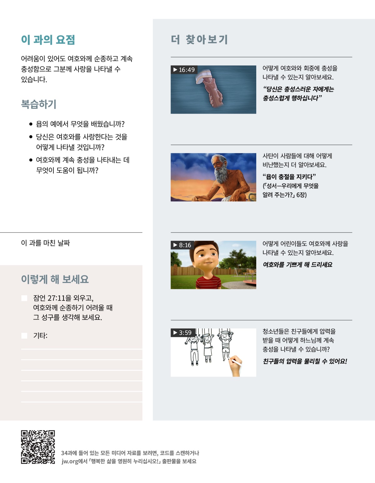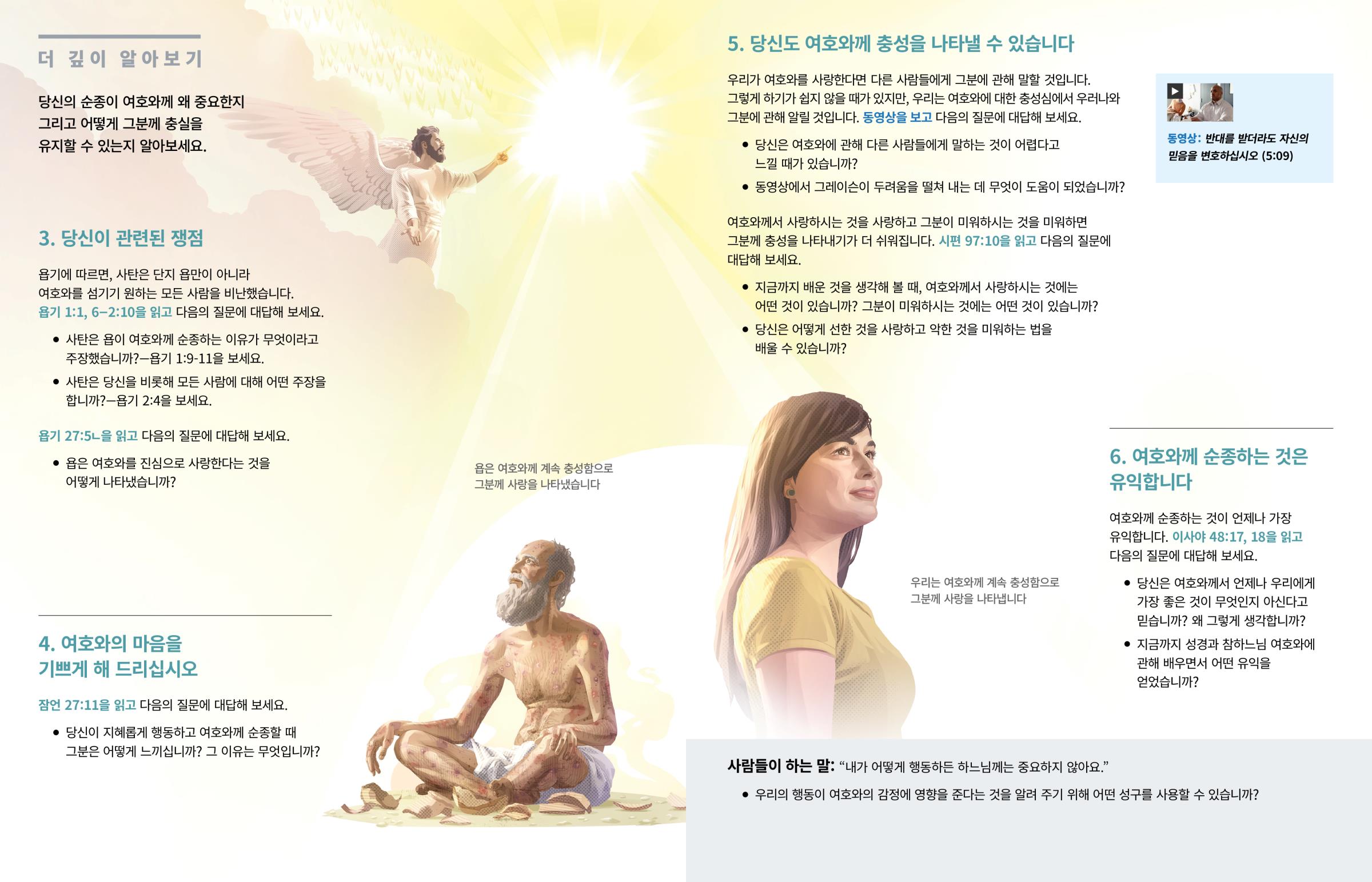 욥기에 따르면, 사탄은 단지 욥만이 아니라 여호와를 섬기기 원하는 모든 사람을 비난했습니다. 욥기 1:1, 6–2:10을 읽고 다음의 질문에 대답해 보세요.