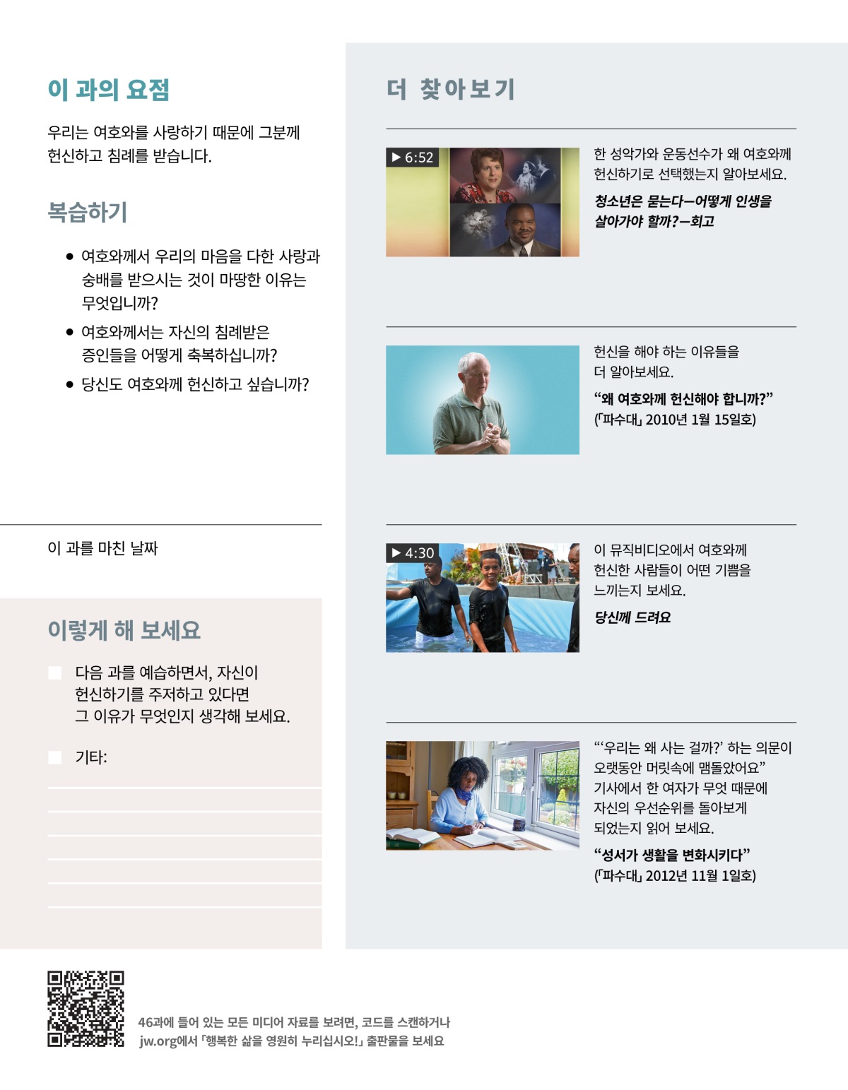 여호와께 헌신한다는 것은 그분만을 숭배하고 삶에서 그분의 뜻을 첫째 자리에 두겠다고 그분께 기도로 약속하는 것입니다. (시편 40:8) 헌신한 후에는 침례를 받습니다. 침례는 자신이 여호와께 헌신했다는 것을 공개적으로 나타내는 것입니다. 여호와께 헌신하겠다는 결정은 사람이 살면서 내릴 수 있는 가장 중요한 결정입니다. 우리는 무엇이 동기가 되어 삶에 큰 변화를 가져올 그처럼 중대한 결정을 내리게 됩니까?