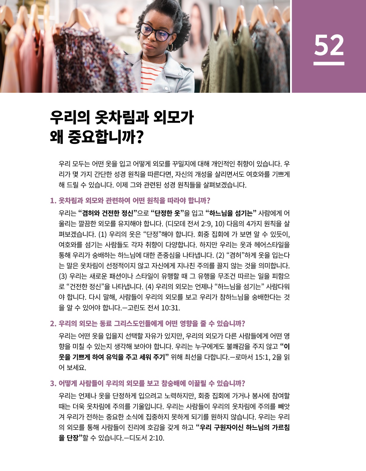 우리는 “겸허와 건전한 정신”으로 “단정한 옷”을 입고 “하느님을 섬기는” 사람에게 어울리는 깔끔한 외모를 유지해야 합니다. (디모데 전서 2:9, 10) 다음의 4가지 원칙을 살펴보겠습니다. (1) 우리의 옷은 “단정”해야 합니다. 회중 집회에 가 보면 알 수 있듯이, 여호와를 섬기는 사람들도 각자 취향이 다양합니다. 하지만 우리는 옷과 헤어스타일을 통해 우리가 숭배하는 하느님에 대한 존중심을 나타냅니다. (2) “겸허”하게 옷을 입는다는 말은 옷차림이 선정적이지 않고 자신에게 지나친 주의를 끌지 않는 것을 의미합니다. (3) 우리는 새로운 패션이나 스타일이 유행할 때 그 유행을 무조건 따르는 일을 피함으로 “건전한 정신”을 나타냅니다. (4) 우리의 외모는 언제나 “하느님을 섬기는” 사람다워야 합니다. 다시 말해, 사람들이 우리의 외모를 보고 우리가 참하느님을 숭배한다는 것을 알 수 있어야 합니다.—고린도 전서 10:31.