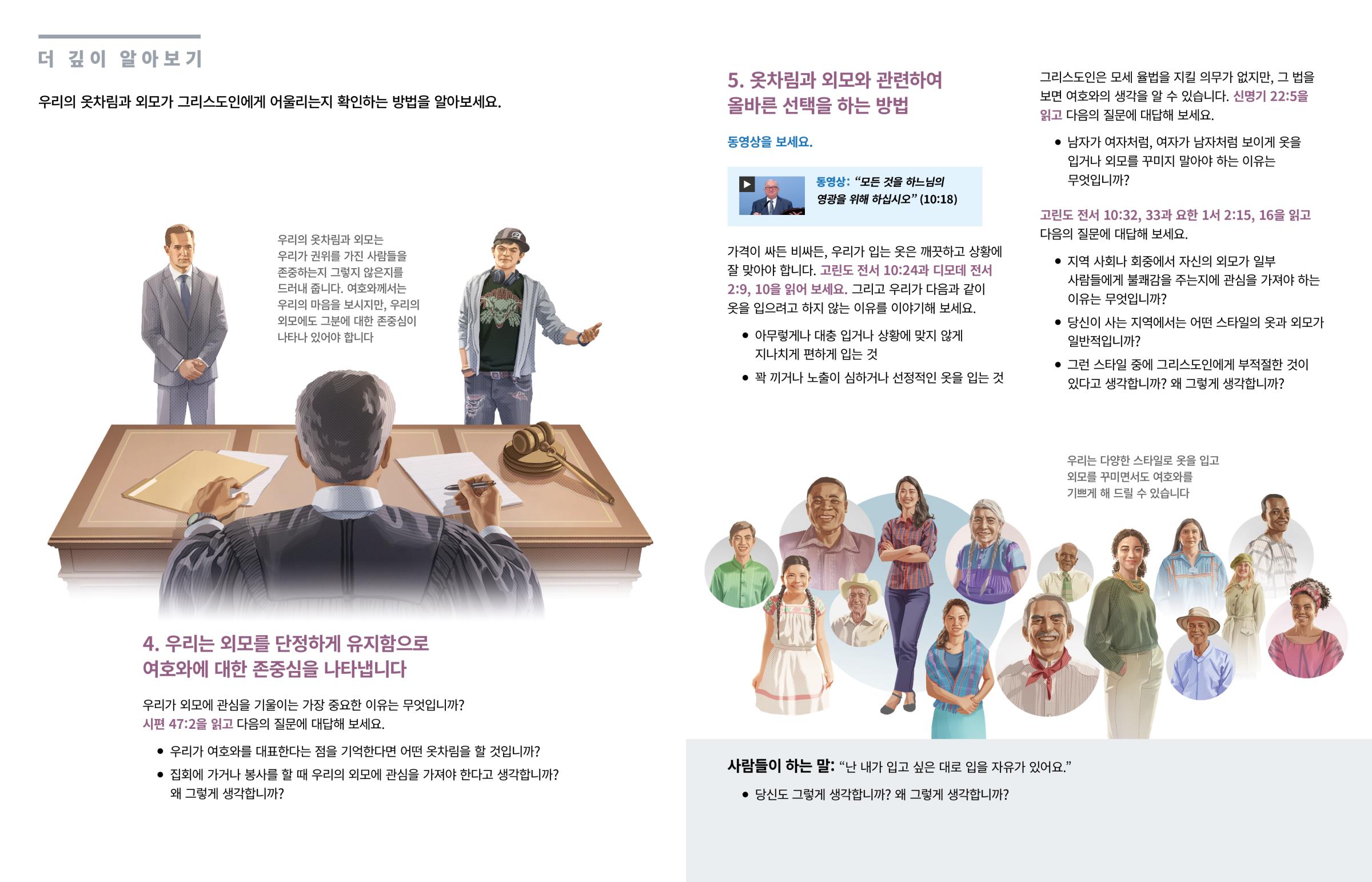 우리의 옷차림과 외모는 우리가 권위를 가진 사람들을 존중하는지 그렇지 않은지를 드러내 줍니다. 여호와께서는 우리의 마음을 보시지만, 우리의 외모에도 그분에 대한 존중심이 나타나 있어야 합니다