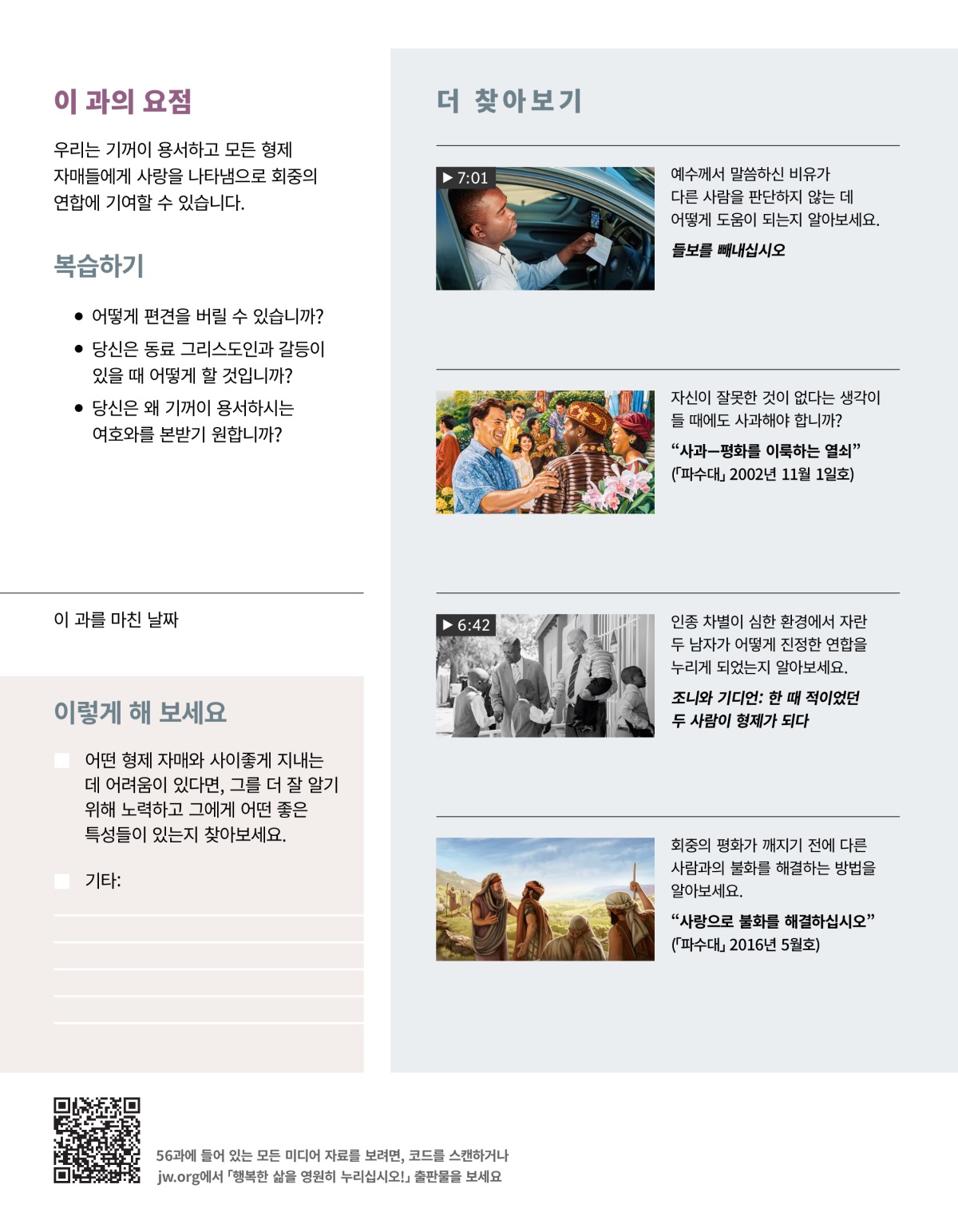 우리는 기꺼이 용서하고 모든 형제 자매들에게 사랑을 나타냄으로 회중의 연합에 기여할 수 있습니다.
