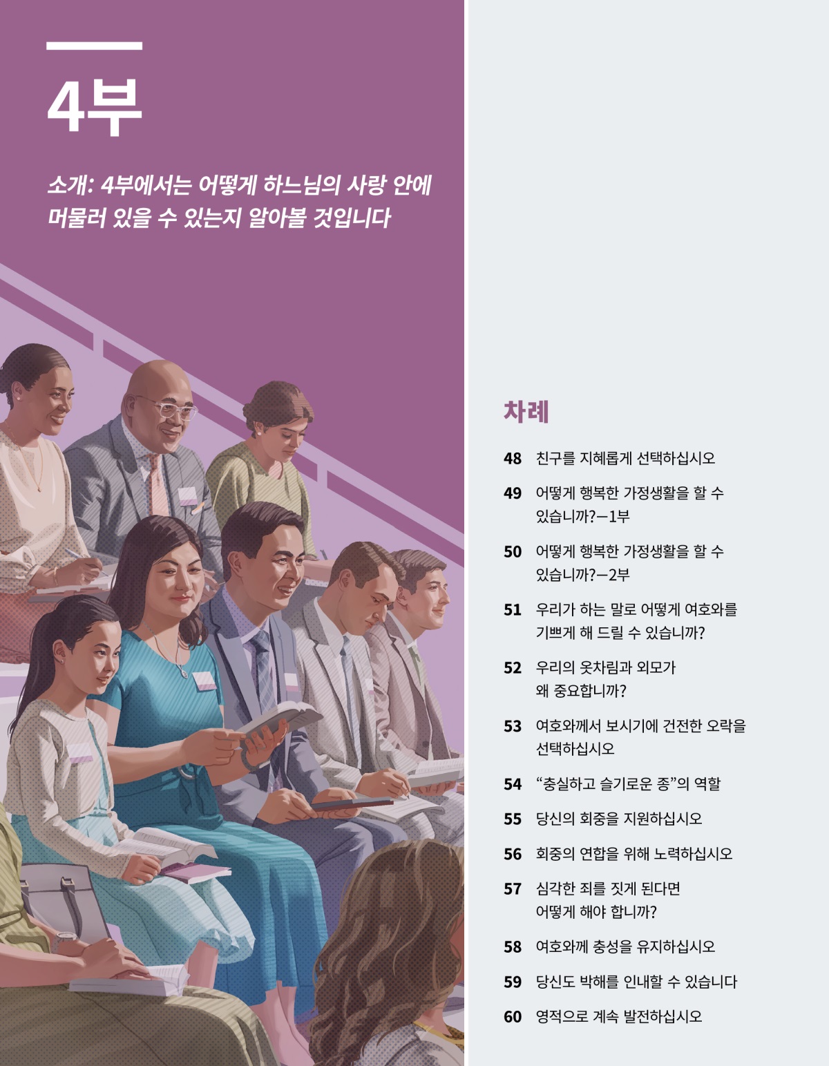 4부 인쇄판 소개: 4부에서는 어떻게 하느님의 사랑 안에 머물러 있을 수 있는지 알아볼 것입니다 차례 48 친구를 지혜롭게 선택하십시오 49 어떻게 행복한 가정생활을 할 수 있습니까?—1부 50 어떻게 행복한 가정생활을 할 수 있습니까?—2부 51 우리가 하는 말로 어떻게 여호와를 기쁘게 해 드릴 수 있습니까? 52 우리의 옷차림과 외모가 왜 중요합니까? 53 여호와께서 보시기에 건전한 오락을 선택하십시오 54 “충실하고 슬기로운 종”의 역할 55 당신의 회중을 지원하십시오 56 회중의 연합을 위해 노력하십시오 57 심각한 죄를 짓게 된다면 어떻게 해야 합니까? 58 여호와께 충성을 유지하십시오 59 당신도 박해를 인내할 수 있습니다 60 영적으로 계속 발전하십시오