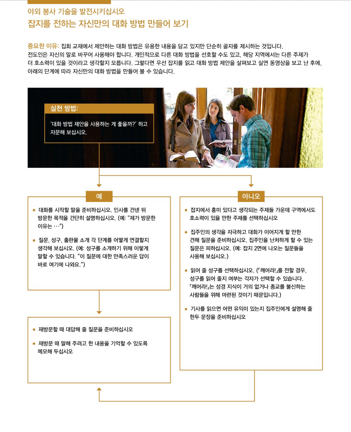 야외 봉사 기술을 발전시키십시오—잡지를 전하는 자신만의 대화 방법 만들어 보기