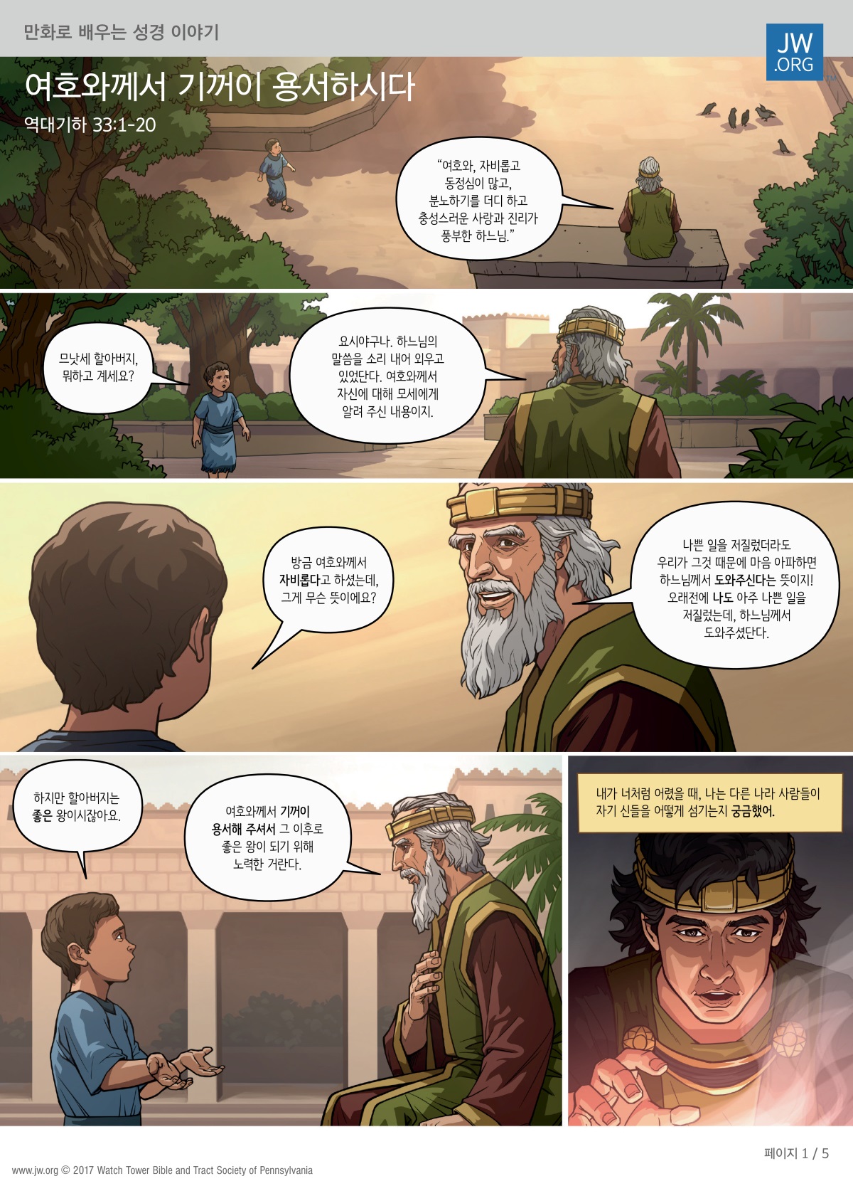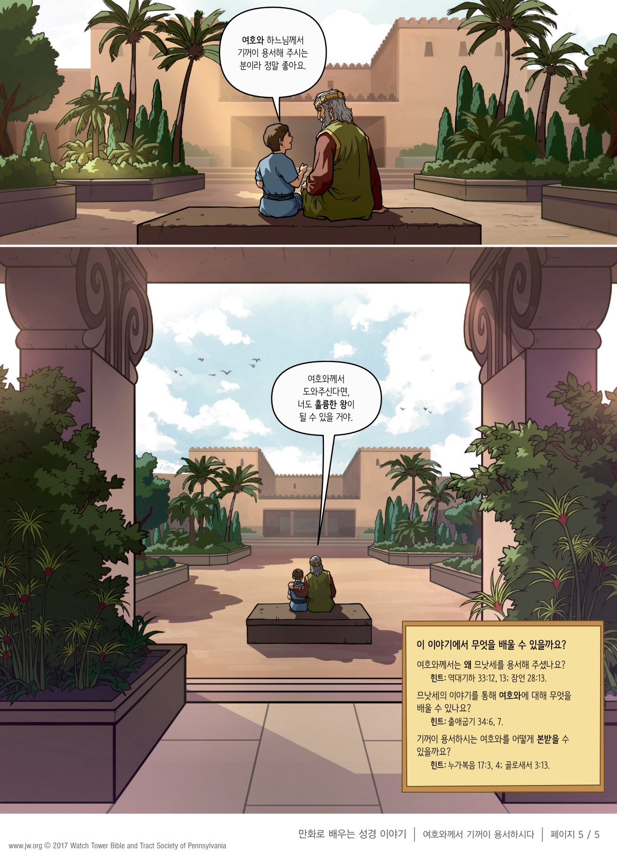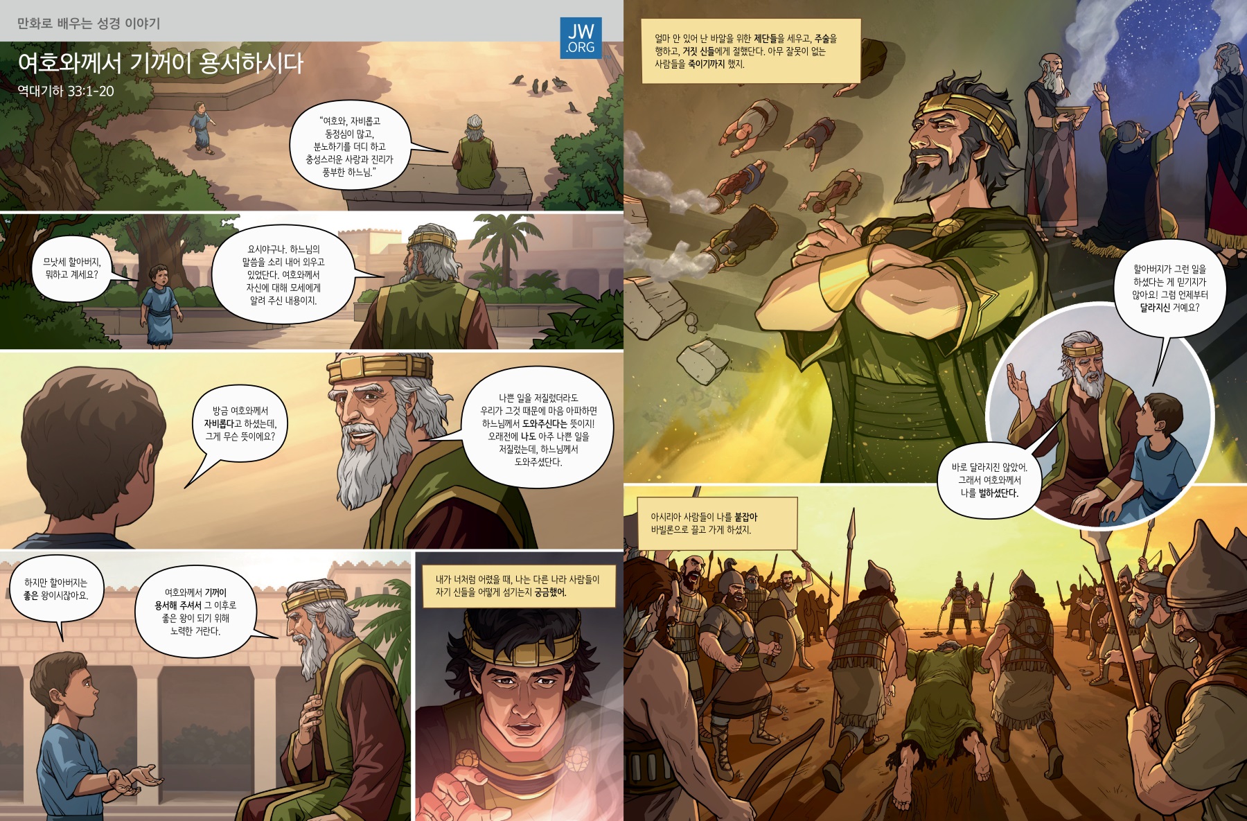 만화로 배우는 성경 이야기 여호와께서 기꺼이 용서하시다 므낫세 왕은 아주 나쁜 일들을 저질렀지만 여호와께서는 그를 용서해 주셨어요. 그 이유가 무엇일까요? 만화로 배우는 이 이야기를 다운로드해서 읽거나 인쇄해서 읽어 보세요. 다운로드