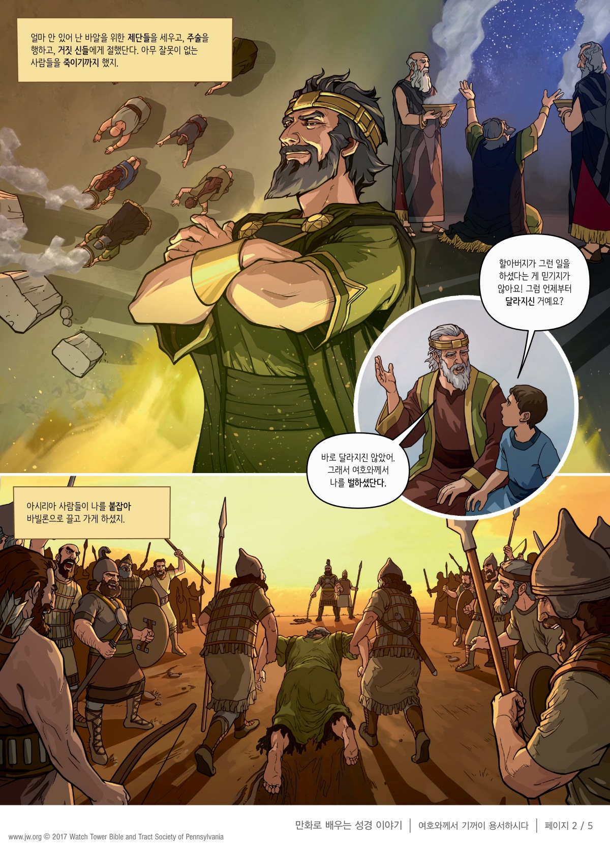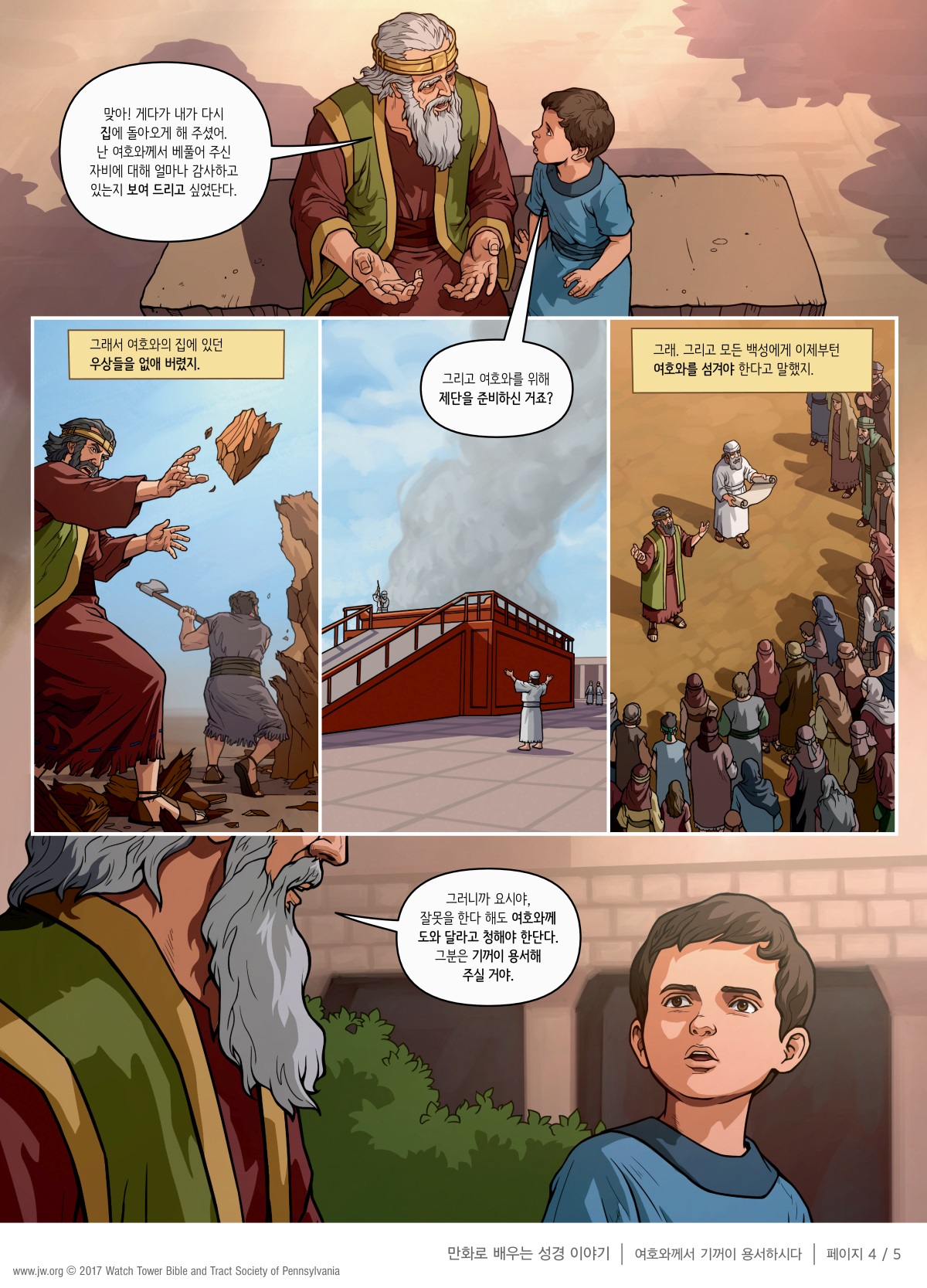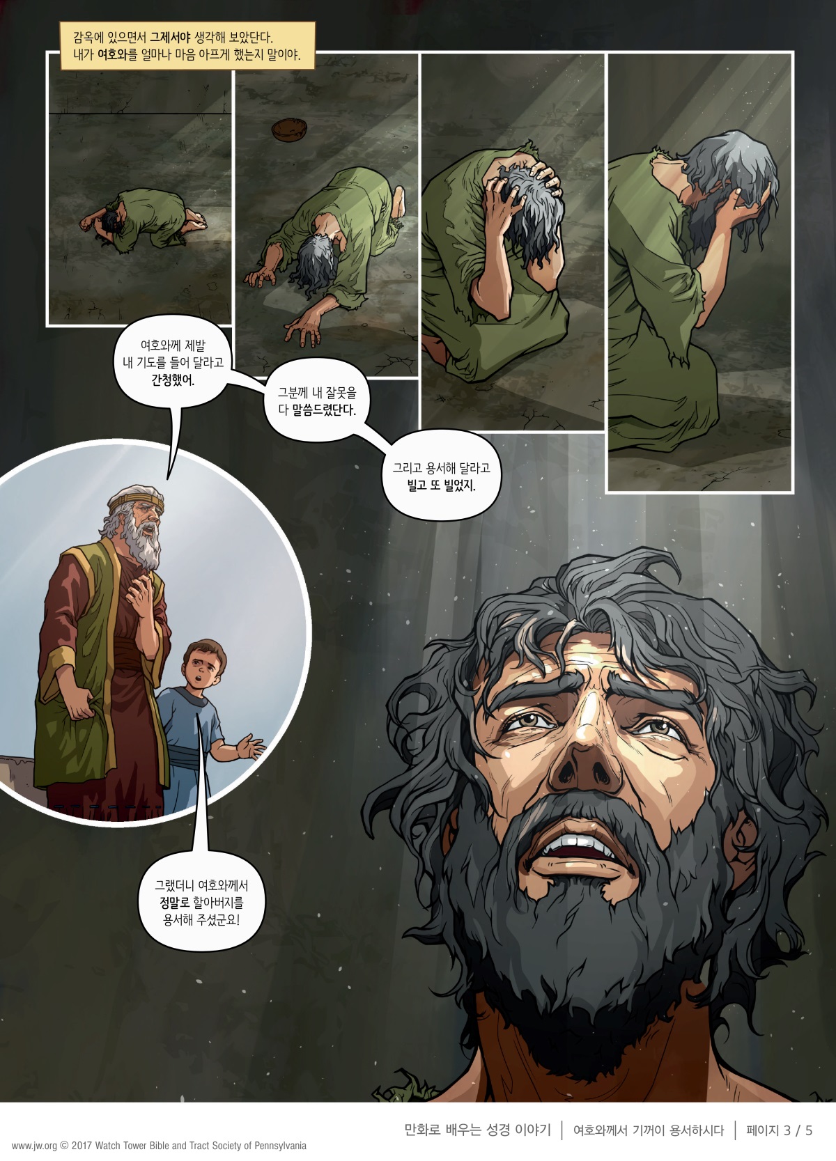만화로 배우는 성경 이야기 여호와께서 기꺼이 용서하시다 므낫세 왕은 아주 나쁜 일들을 저질렀지만 여호와께서는 그를 용서해 주셨어요. 그 이유가 무엇일까요? 만화로 배우는 이 이야기를 다운로드해서 읽거나 인쇄해서 읽어 보세요. 다운로드