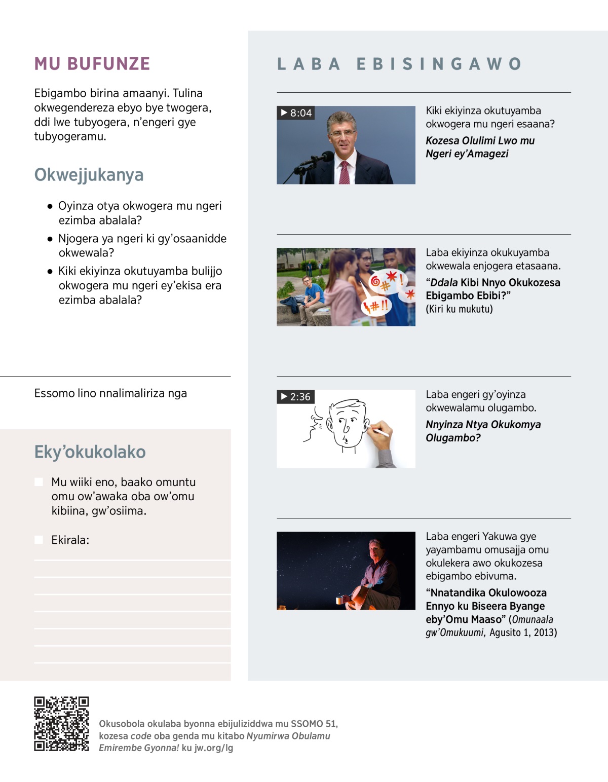 Bayibuli etukubiriza ‘okuzziŋŋanangamu amaanyi era n’okuzimbagananga.’ (1 Abassessalonika 5:11) Waliwo b’oyinza okulowoozaako abeetaaga okuzzibwamu amaanyi? Kiki ky’oyinza okukola okubazzaamu amaanyi? Bakakase nti obafaako. Oboolyawo oyinza okubabuulira ebintu by’obasiimako. Waliwo ekyawandiikibwa ky’oyinza okulowoozaako ekiyinza okuzzaamu omuntu omulala amaanyi? Waliwo ebyawandiikibwa bingi ebizzaamu amaanyi by’osobola okukozesa. Ate era kijjukire nti ng’oggyeeko okuba nti ebigambo by’oyogera bisobola okukwata ennyo ku muntu, engeri gy’obyogeramu nayo nkulu nnyo. N’olwekyo, bulijjo fuba okwogera mu ngeri ey’ekisa era ey’obukkakkamu.—Engero 15:1.