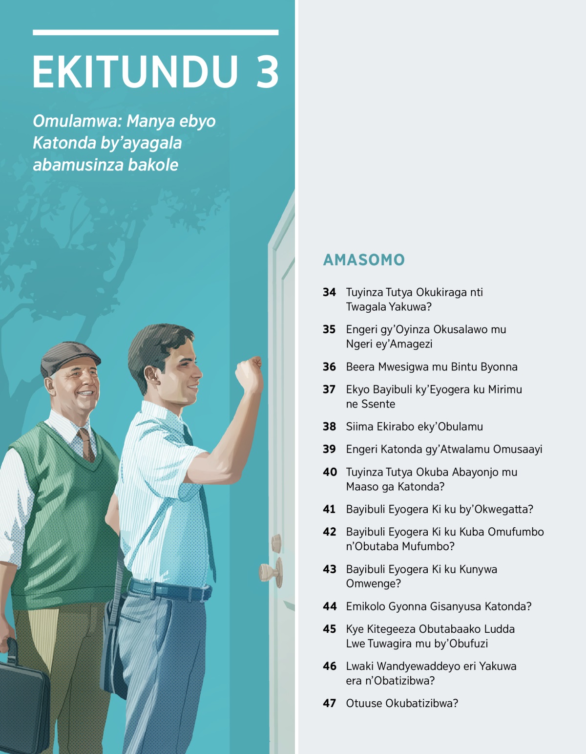 Ekitundu 3 Printed Edition Omulamwa: Manya ebyo Katonda by’ayagala abamusinza bakole AMASOMO 34 Tuyinza Tutya Okukiraga nti Twagala Yakuwa? 35 Engeri gy’Oyinza Okusalawo mu Ngeri ey’Amagezi 36 Beera Mwesigwa mu Bintu Byonna 37 Ekyo Bayibuli ky’Eyogera ku Mirimu ne Ssente 38 Siima Ekirabo eky’Obulamu 39 Engeri Katonda gy’Atwalamu Omusaayi 40 Tuyinza Tutya Okuba Abayonjo mu Maaso ga Katonda? 41 Bayibuli Eyogera Ki ku by’Okwegatta? 42 Bayibuli Eyogera Ki ku Kuba Omufumbo n’Obutaba Mufumbo? 43 Bayibuli Eyogera Ki ku Kunywa Omwenge? 44 Emikolo Gyonna Gisanyusa Katonda? 45 Kye Kitegeeza Obutabaako Ludda Lwe Tuwagira mu by’Obufuzi 46 Lwaki Wandyewaddeyo eri Yakuwa era n’Obatizibwa? 47 Otuuse Okubatizibwa?