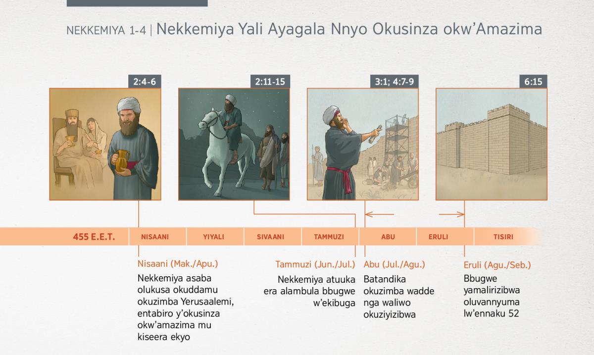 - Tammuzi (Jun./Jul.) - 2:11-15 Nekkemiya atuuka era alambula bbugwe w’ekibuga