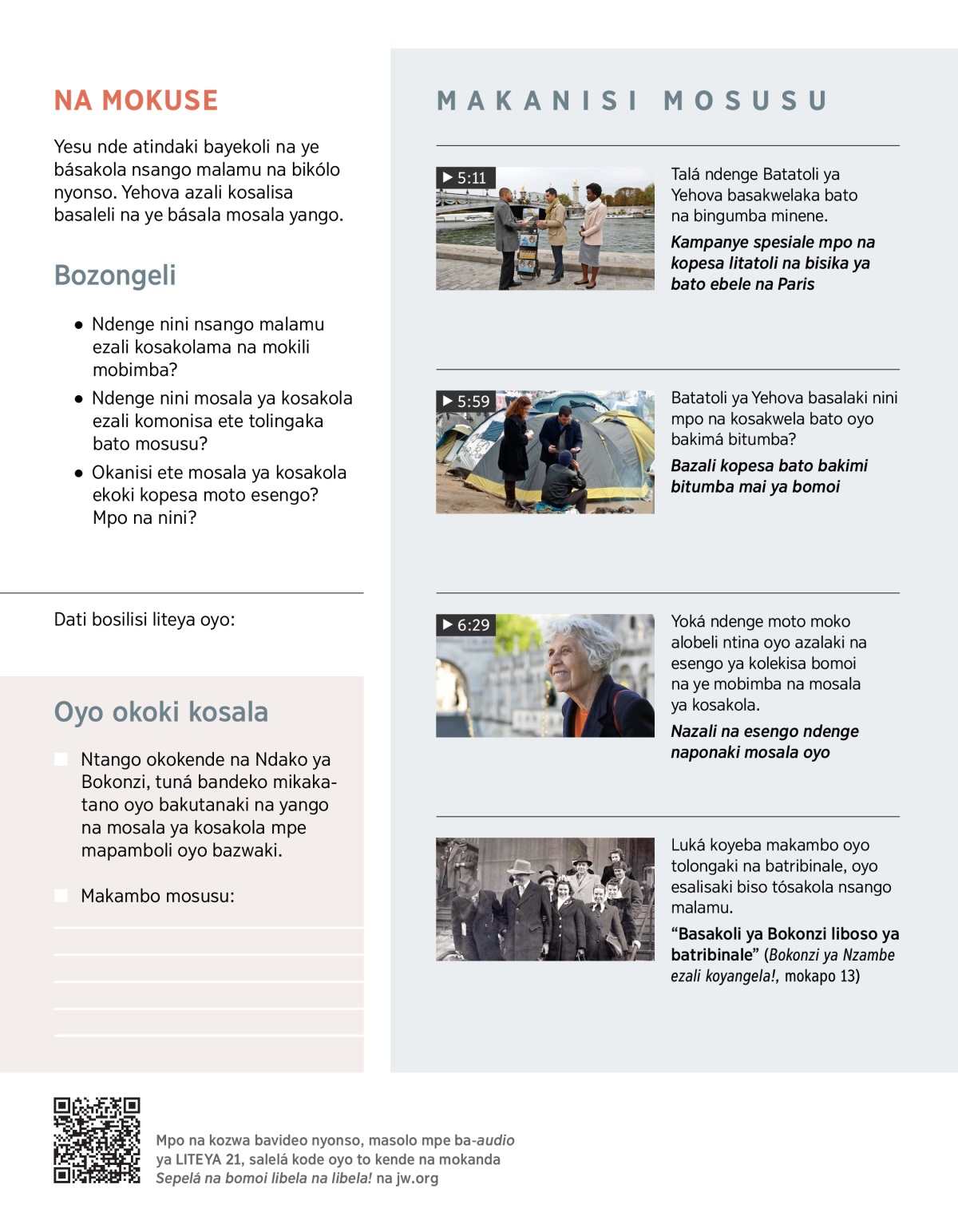 Yesu alobaki: “Nsango malamu oyo ya Bokonzi ekosakolama na mabele mobimba esika bato bafandi.” (Matai 24:14) Batatoli ya Yehova bazalaka na esengo ya kosala mosala yango mpo ezali na ntina mingi. Tosakolaka nsango malamu na mokili mobimba na minɔkɔ koleka 1 000! Lokola mosala yango ezali monene, esɛngaka milende mingi mpe esɛngaka kobongisa makambo malamu. Mosala yango esalemaka kaka na lisalisi ya Yehova.