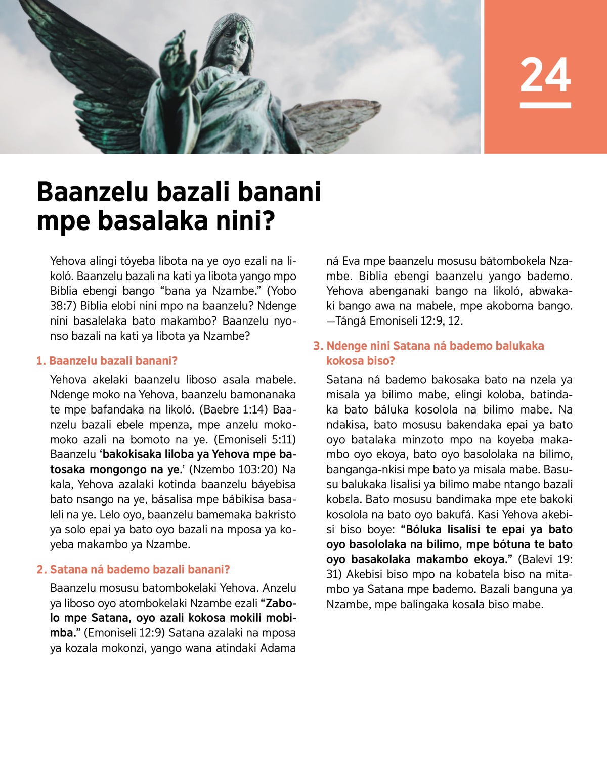 Yehova akelaki baanzelu liboso asala mabele. Ndenge moko na Yehova, baanzelu bamonanaka te mpe bafandaka na likoló. (Baebre 1:14) Baanzelu bazali ebele mpenza, mpe anzelu mokomoko azali na bomoto na ye. (Emoniseli 5:11) Baanzelu ‘bakokisaka liloba ya Yehova mpe batosaka mongongo na ye.’ (Nzembo 103:20) Na kala, Yehova azalaki kotinda baanzelu báyebisa bato nsango na ye, básalisa mpe bábikisa basaleli na ye. Lelo oyo, baanzelu bamemaka bakristo ya solo epai ya bato oyo bazali na mposa ya koyeba makambo ya Nzambe.