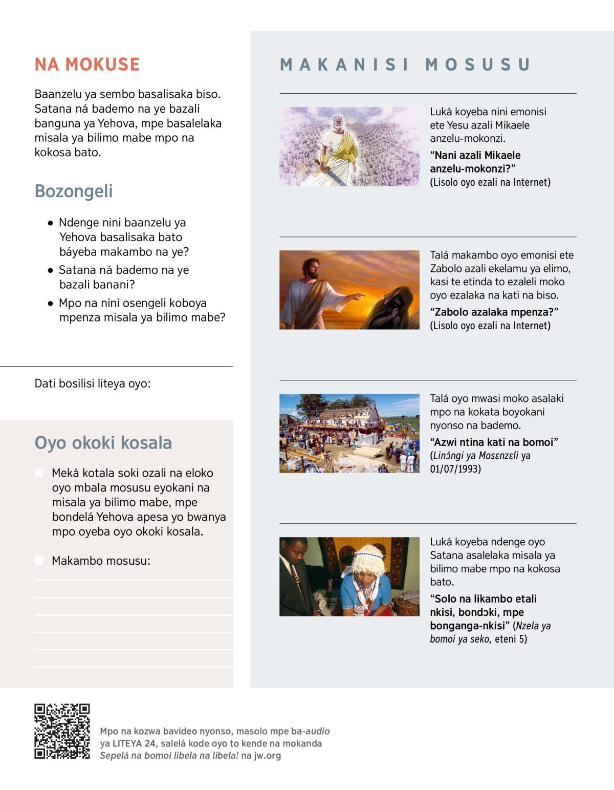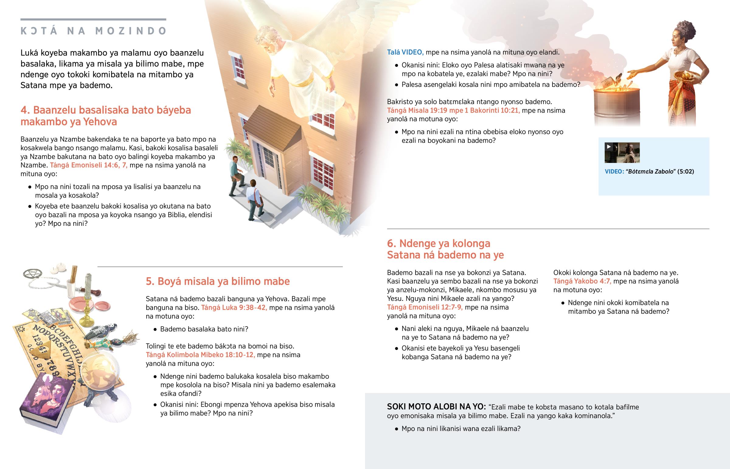 Luká koyeba makambo ya malamu oyo baanzelu basalaka, likama ya misala ya bilimo mabe, mpe ndenge oyo tokoki komibatela na mitambo ya Satana mpe ya bademo.