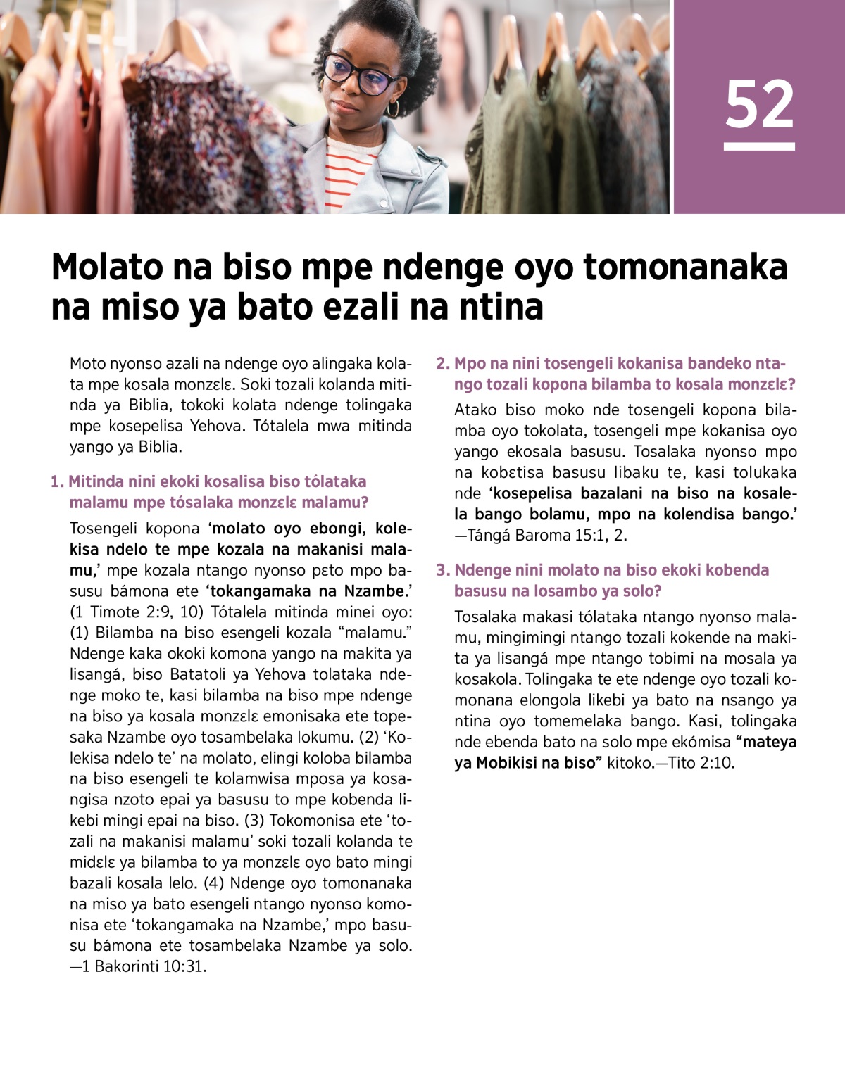 Tosengeli kopona ‘molato oyo ebongi, kolekisa ndelo te mpe kozala na makanisi malamu,’ mpe kozala ntango nyonso pɛto mpo basusu bámona ete ‘tokangamaka na Nzambe.’ (1 Timote 2:9, 10) Tótalela mitinda minei oyo: (1) Bilamba na biso esengeli kozala “malamu.” Ndenge kaka okoki komona yango na makita ya lisangá, biso Batatoli ya Yehova tolataka ndenge moko te, kasi bilamba na biso mpe ndenge na biso ya kosala monzɛlɛ emonisaka ete topesaka Nzambe oyo tosambelaka lokumu. (2) ‘Kolekisa ndelo te’ na molato, elingi koloba bilamba na biso esengeli te kolamwisa mposa ya kosangisa nzoto epai ya basusu to mpe kobenda likebi mingi epai na biso. (3) Tokomonisa ete ‘tozali na makanisi malamu’ soki tozali kolanda te midɛlɛ ya bilamba to ya monzɛlɛ oyo bato mingi bazali kosala lelo. (4) Ndenge oyo tomonanaka na miso ya bato esengeli ntango nyonso komonisa ete ‘tokangamaka na Nzambe,’ mpo basusu bámona ete tosambelaka Nzambe ya solo.—1 Bakorinti 10:31.