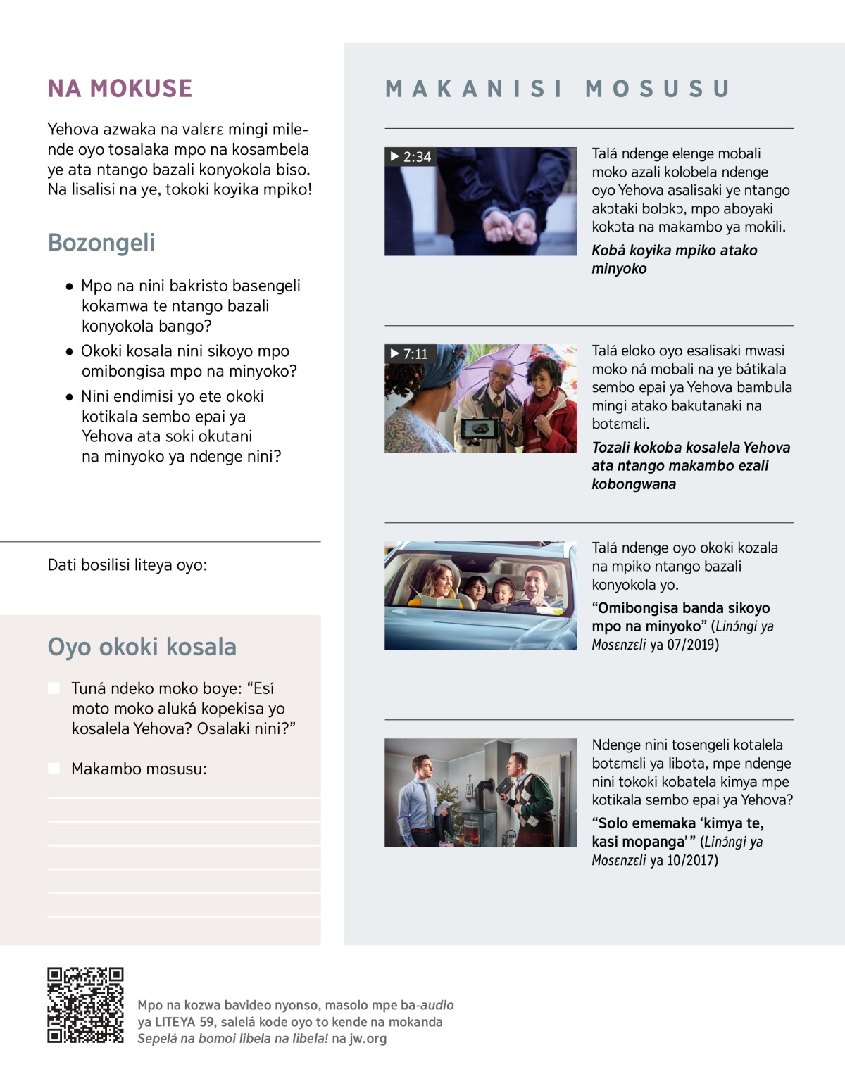 Batatoli ya Yehova, ezala bilenge to mikóló, na mokili mobimba bakobaki kosambela Yehova ata ntango bazalaki konyokola bango. Mpo na komona oyo esalisaki bango, talá VIDEO. Na nsima yanolá na motuna oyo elandi.