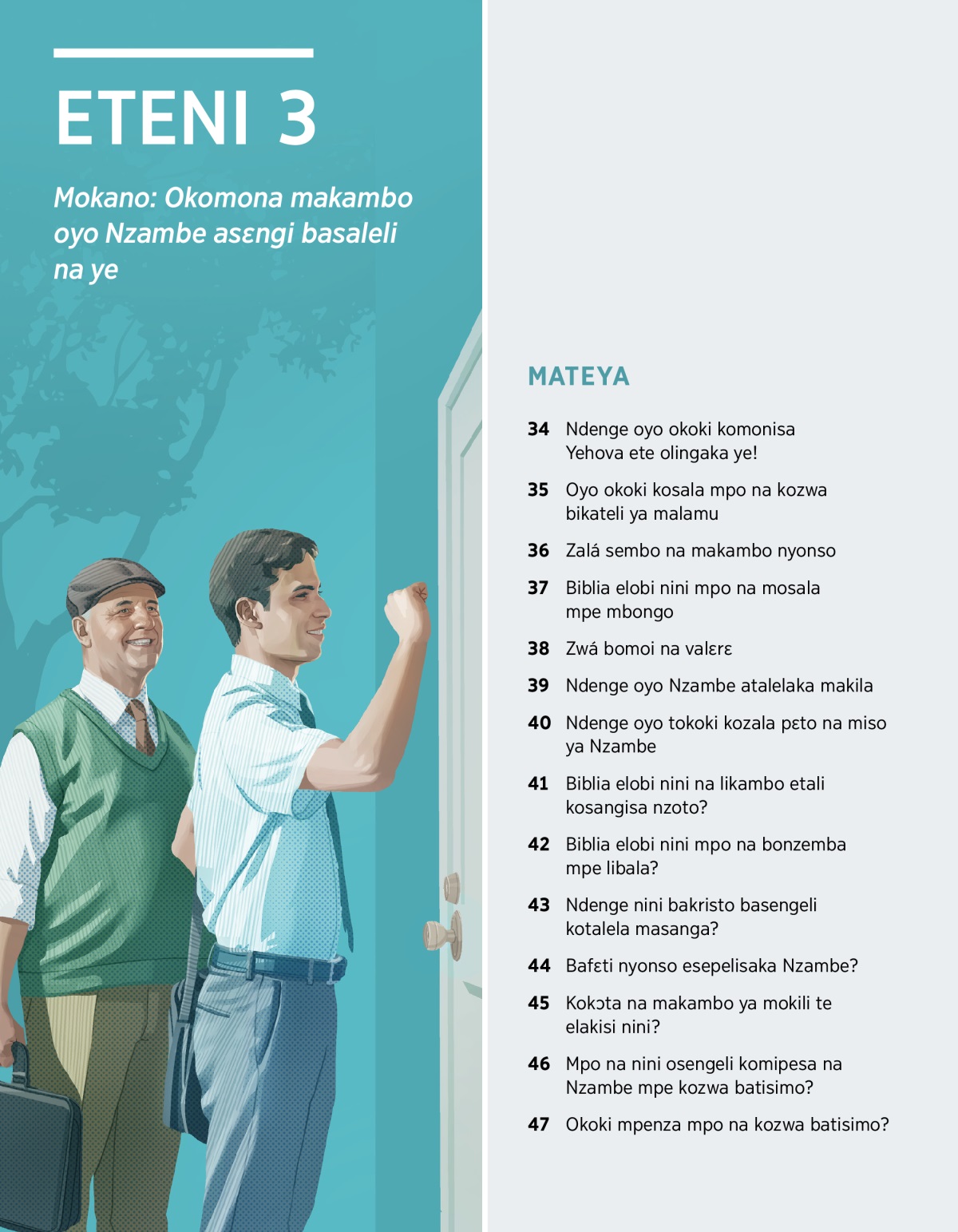 Eteni 3 Ya Papye Mokano: Okomona makambo oyo Nzambe asɛngi basaleli na ye MATEYA 34 Ndenge oyo okoki komonisa Yehova ete olingaka ye! 35 Oyo okoki kosala mpo na kozwa bikateli ya malamu 36 Zalá sembo na makambo nyonso 37 Biblia elobi nini mpo na mosala mpe mbongo 38 Zwá bomoi na valɛrɛ 39 Ndenge oyo Nzambe atalelaka makila 40 Ndenge oyo tokoki kozala pɛto na miso ya Nzambe 41 Biblia elobi nini na likambo etali kosangisa nzoto? 42 Biblia elobi nini mpo na bonzemba mpe libala? 43 Ndenge nini bakristo basengeli kotalela masanga? 44 Bafɛti nyonso esepelisaka Nzambe? 45 Kokɔta na makambo ya mokili te elakisi nini? 46 Mpo na nini osengeli komipesa na Nzambe mpe kozwa batisimo? 47 Okoki mpenza mpo na kozwa batisimo?