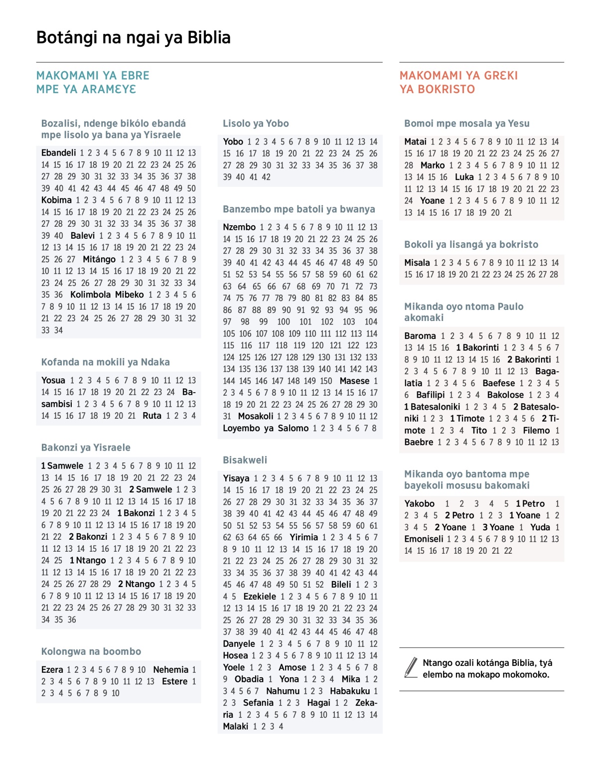 Botángi na ngai ya Biblia Ya Papye Bozalisi, ndenge bikólo ebandá mpe lisolo ya bana ya Yisraele Kofanda na mokili ya Ndaka Bakonzi ya Yisraele Kolongwa na boombo Lisolo ya Yobo Banzembo mpe batoli ya bwanya Bisakweli Bomoi mpe mosala ya Yesu Bokoli ya lisangá ya bokristo Mikanda oyo ntoma Paulo akomaki Mikanda oyo bantoma mpe bayekoli mosusu bakomaki Ntango ozali kotánga Biblia, tyá elembo na mokapo mokomoko. MAKOMAMI YA EBRE MPE YA ARAMƐYƐ Bozalisi, ndenge bikólo ebandá mpe lisolo ya bana ya Yisraele Ebandeli 1 2 3 4 5 6 7 8 9 10 11 12 13 14 15 16 17 18 19 20 21 22 23 24 25 26 27 28 29 30 31 32 33 34 35 36 37 38 39 40 41 42 43 44 45 46 47 48 49 50 Kobima 1 2 3 4 5 6 7 8 9 10 11 12 13 14 15 16 17 18 19 20 21 22 23 24 25 26 27 28 29 30 31 32 33 34 35 36 37 38 39 40 Balevi 1 2 3 4 5 6 7 8 9 10 11 12 13 14 15 16 17 18 19 20 21 22 23 24 25 26 27 Mitángo 1 2 3 4 5 6 7 8 9 10 11 12 13 14 15 16 17 18 19 20 21 22 23 24 25 26 27 28 29 30 31 32 33 34 35 36 Kolimbola Mibeko 1 2 3 4 5 6 7 8 9 10 11 12 13 14 15 16 17 18 19 20 21 22 23 24 25 26 27 28 29 30 31 32 33 34 Kofanda na mokili ya Ndaka Yosua 1 2 3 4 5 6 7 8 9 10 11 12 13 14 15 16 17 18 19 20 21 22 23 24 Basambisi 1 2 3 4 5 6 7 8 9 10 11 12 13 14 15 16 17 18 19 20 21 Ruta 1 2 3 4 Bakonzi ya Yisraele 1 Samwele 1 2 3 4 5 6 7 8 9 10 11 12 13 14 15 16 17 18 19 20 21 22 23 24 25 26 27 28 29 30 31 2 Samwele 1 2 3 4 5 6 7 8 9 10 11 12 13 14 15 16 17 18 19 20 21 22 23 24 1 Bakonzi 1 2 3 4 5 6 7 8 9 10 11 12 13 14 15 16 17 18 19 20 21 22 2 Bakonzi 1 2 3 4 5 6 7 8 9 10 11 12 13 14 15 16 17 18 19 20 21 22 23 24 25 1 Ntango 1 2 3 4 5 6 7 8 9 10 11 12 13 14 15 16 17 18 19 20 21 22 23 24 25 26 27 28 29 2 Ntango 1 2 3 4 5 6 7 8 9 10 11 12 13 14 15 16 17 18 19 20 21 22 23 24 25 26 27 28 29 30 31 32 33 34 35 36 Kolongwa na boombo Ezera 1 2 3 4 5 6 7 8 9 10 Nehemia 1 2 3 4 5 6 7 8 9 10 11 12 13 Estere 1 2 3 4 5 6 7 8 9 10 Lisolo ya Yobo Yobo 1 2 3 4 5 6 7 8 9 10 11 12 13 14 15 16 17 18 19 20 21 22 23 24 25 26 27 28 29 30 31 32 33 34 35 36 37 38 39 40 41 42 Banzembo mpe batoli ya bwanya Nzembo 1 2 3 4 5 6 7 8 9 10 11 12 13 14 15 16 17 18 19 20 21 22 23 24 25 26 27 28 29 30 31 32 33 34 35 36 37 38 39 40 41 42 43 44 45 46 47 48 49 50 51 52 53 54 55 56 57 58 59 60 61 62 63 64 65 66 67 68 69 70 71 72 73 74 75 76 77 78 79 80 81 82 83 84 85 86 87 88 89 90 91 92 93 94 95 96 97 98 99 100 101 102 103 104 105 106 107 108 109 110 111 112 113 114 115 116 117 118 119 120 121 122 123 124 125 126 127 128 129 130 131 132 133 134 135 136 137 138 139 140 141 142 143 144 145 146 147 148 149 150 Masese 1 2 3 4 5 6 7 8 9 10 11 12 13 14 15 16 17 18 19 20 21 22 23 24 25 26 27 28 29 30 31 Mosakoli 1 2 3 4 5 6 7 8 9 10 11 12 Loyembo ya Salomo 1 2 3 4 5 6 7 8 Bisakweli Yisaya 1 2 3 4 5 6 7 8 9 10 11 12 13 14 15 16 17 18 19 20 21 22 23 24 25 26 27 28 29 30 31 32 33 34 35 36 37 38 39 40 41 42 43 44 45 46 47 48 49 50 51 52 53 54 55 56 57 58 59 60 61 62 63 64 65 66 Yirimia 1 2 3 4 5 6 7 8 9 10 11 12 13 14 15 16 17 18 19 20 21 22 23 24 25 26 27 28 29 30 31 32 33 34 35 36 37 38 39 40 41 42 43 44 45 46 47 48 49 50 51 52 Bileli 1 2 3 4 5 Ezekiele 1 2 3 4 5 6 7 8 9 10 11 12 13 14 15 16 17 18 19 20 21 22 23 24 25 26 27 28 29 30 31 32 33 34 35 36 37 38 39 40 41 42 43 44 45 46 47 48 Danyele 1 2 3 4 5 6 7 8 9 10 11 12 Hosea 1 2 3 4 5 6 7 8 9 10 11 12 13 14 Yoele 1 2 3 Amose 1 2 3 4 5 6 7 8 9 Obadia 1 Yona 1 2 3 4 Mika 1 2 3 4 5 6 7 Nahumu 1 2 3 Habakuku 1 2 3 Sefania 1 2 3 Hagai 1 2 Zekaria 1 2 3 4 5 6 7 8 9 10 11 12 13 14 Malaki 1 2 3 4 MAKOMAMI YA GRƐKI YA BOKRISTO Bomoi mpe mosala ya Yesu Matai 1 2 3 4 5 6 7 8 9 10 11 12 13 14 15 16 17 18 19 20 21 22 23 24 25 26 27 28 Marko 1 2 3 4 5 6 7 8 9 10 11 12 13 14 15 16 Luka 1 2 3 4 5 6 7 8 9 10 11 12 13 14 15 16 17 18 19 20 21 22 23 24 Yoane 1 2 3 4 5 6 7 8 9 10 11 12 13 14 15 16 17 18 19 20 21 Bokoli ya lisangá ya bokristo Misala 1 2 3 4 5 6 7 8 9 10 11 12 13 14 15 16 17 18 19 20 21 22 23 24 25 26 27 28 Mikanda oyo ntoma Paulo akomaki Baroma 1 2 3 4 5 6 7 8 9 10 11 12 13 14 15 16 1 Bakorinti 1 2 3 4 5 6 7 8 9 10 11 12 13 14 15 16 2 Bakorinti 1 2 3 4 5 6 7 8 9 10 11 12 13 Bagalatia 1 2 3 4 5 6 Baefese 1 2 3 4 5 6 Bafilipi 1 2 3 4 Bakolose 1 2 3 4 1 Batesaloniki 1 2 3 4 5 2 Batesaloniki 1 2 3 1 Timote 1 2 3 4 5 6 2 Timote 1 2 3 4 Tito 1 2 3 Filemo 1 Baebre 1 2 3 4 5 6 7 8 9 10 11 12 13 Mikanda oyo bantoma mpe bayekoli mosusu bakomaki Yakobo 1 2 3 4 5 1 Petro 1 2 3 4 5 2 Petro 1 2 3 1 Yoane 1 2 3 4 5 2 Yoane 1 3 Yoane 1 Yuda 1 Emoniseli 1 2 3 4 5 6 7 8 9 10 11 12 13 14 15 16 17 18 19 20 21 22