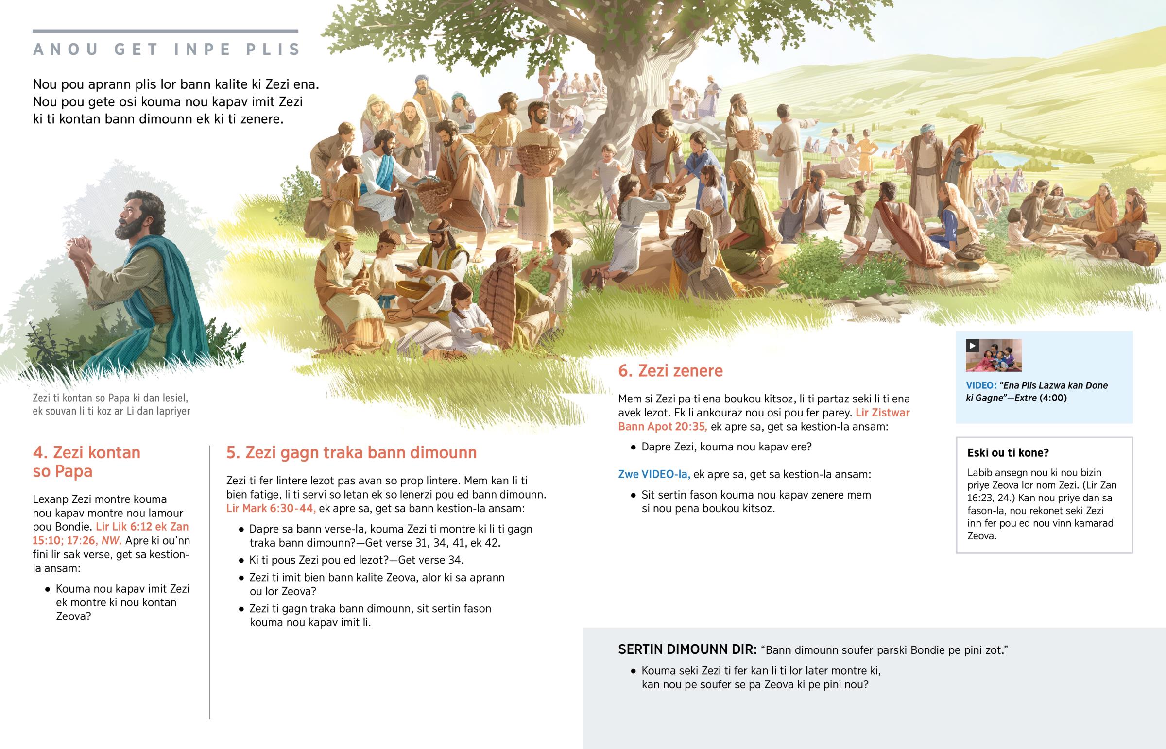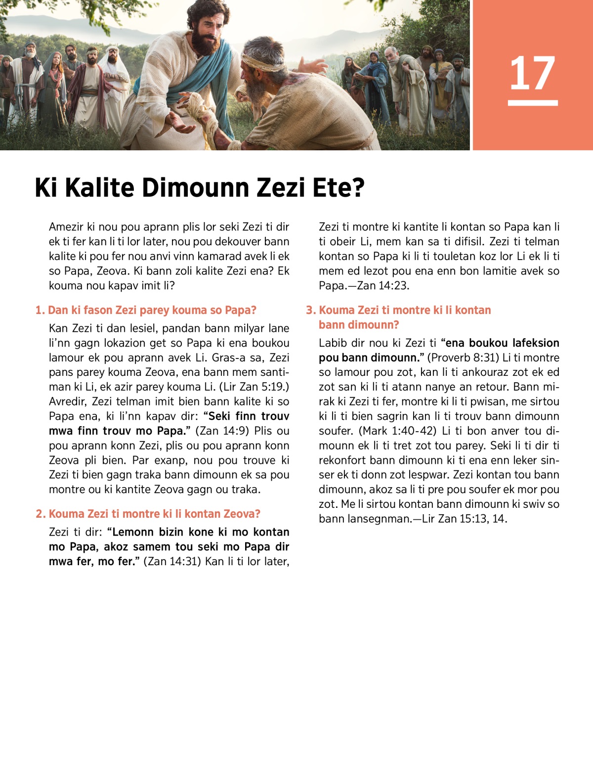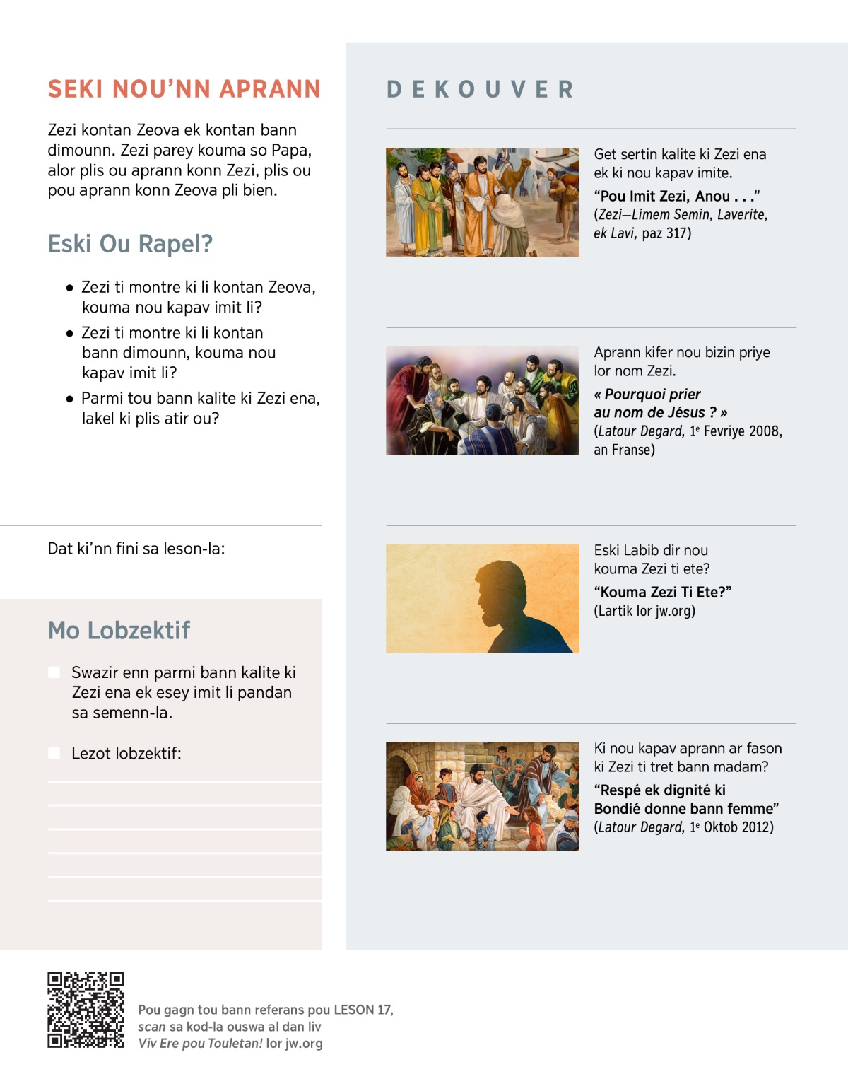 Nou pou aprann plis lor bann kalite ki Zezi ena. Nou pou gete osi kouma nou kapav imit Zezi ki ti kontan bann dimounn ek ki ti zenere.