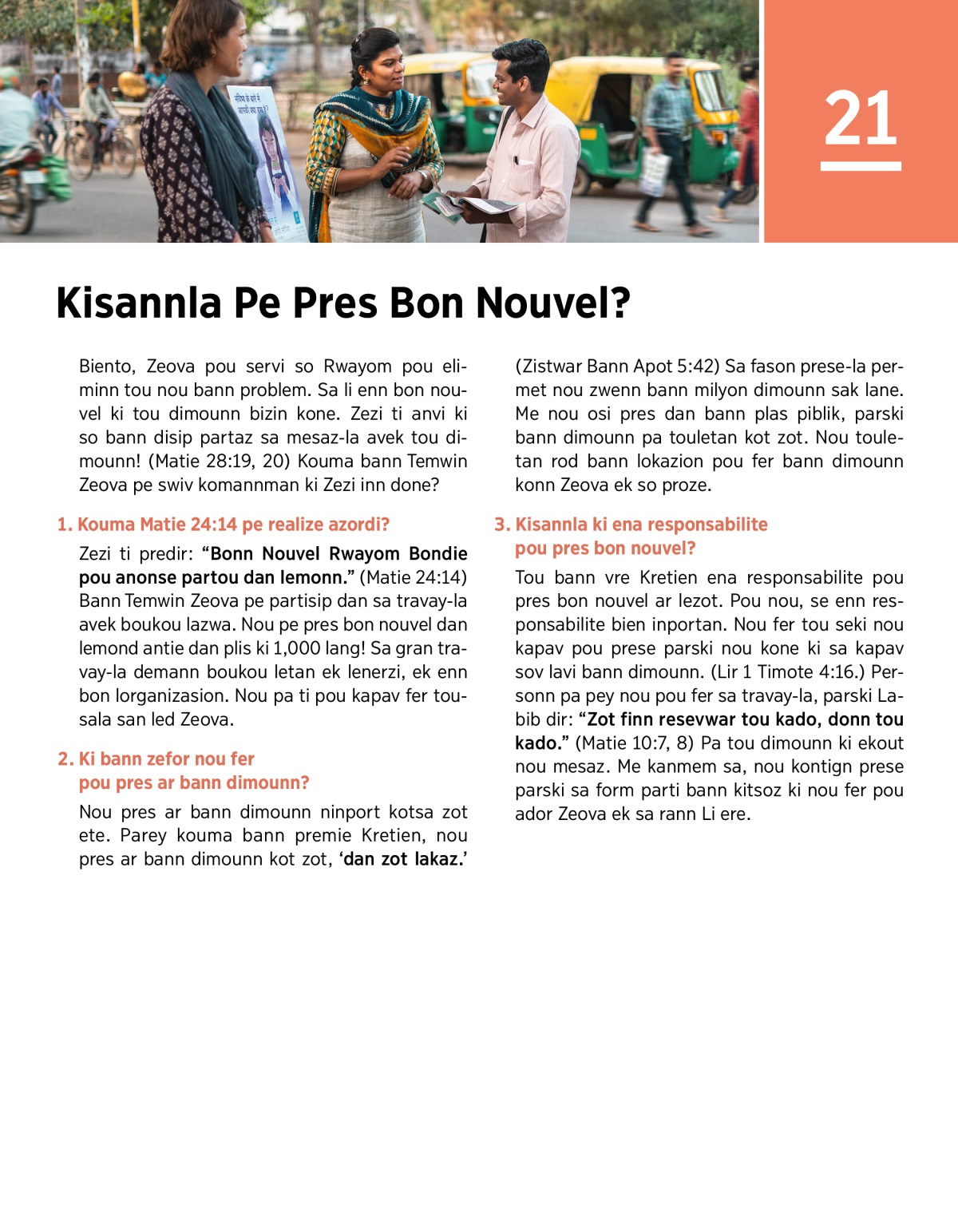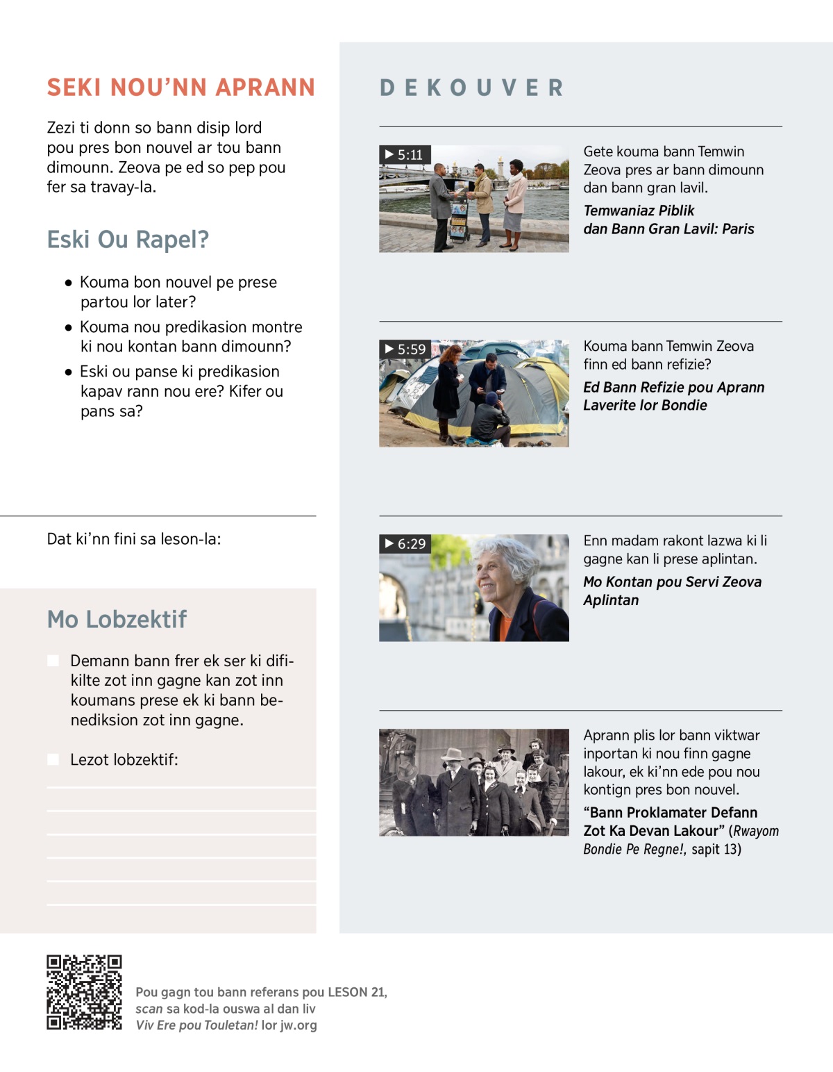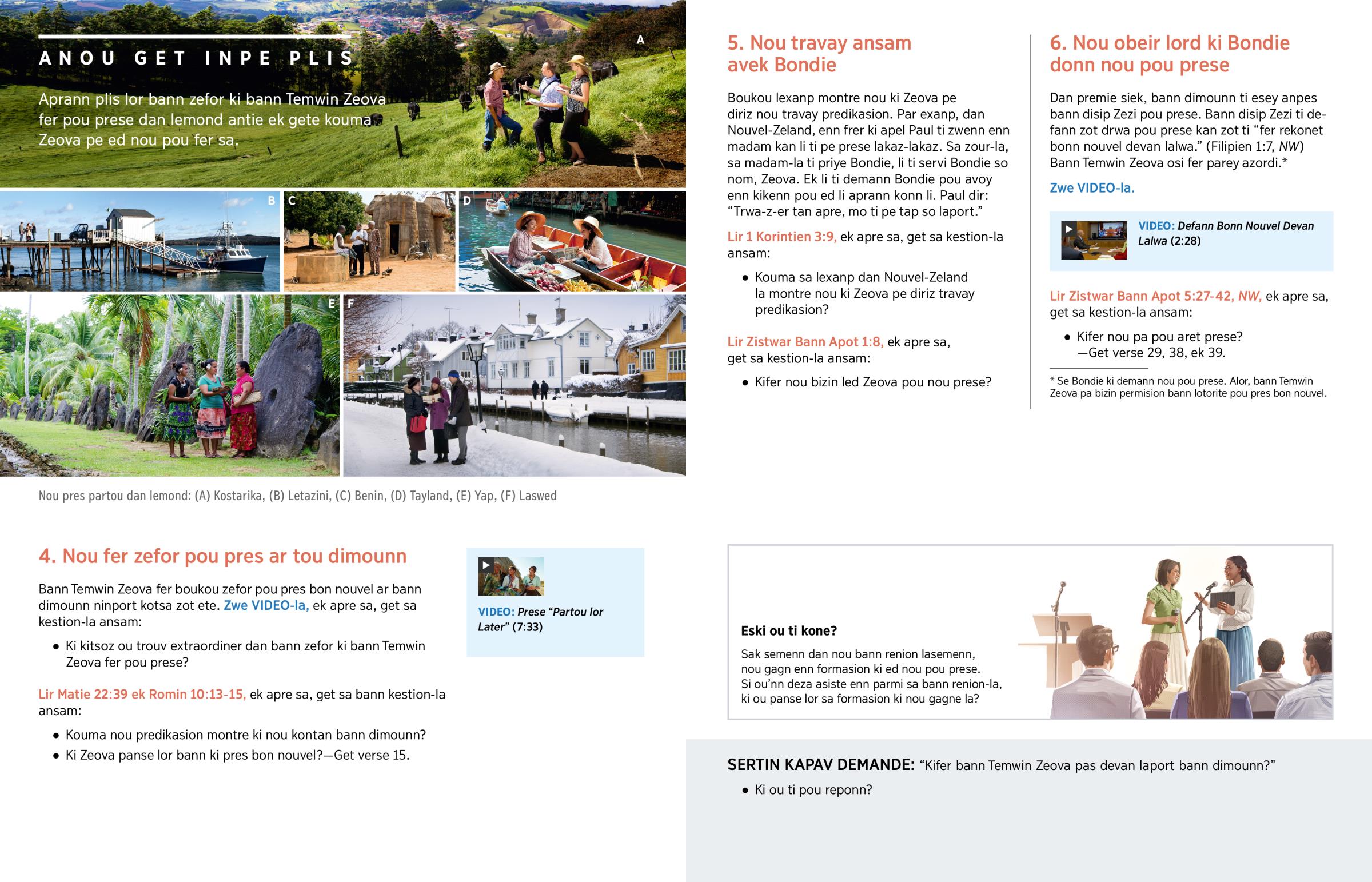 Bann Temwin Zeova fer boukou zefor pou pres bon nouvel ar bann dimounn ninport kotsa zot ete. Zwe VIDEO-la, ek apre sa, get sa kestion-la ansam: