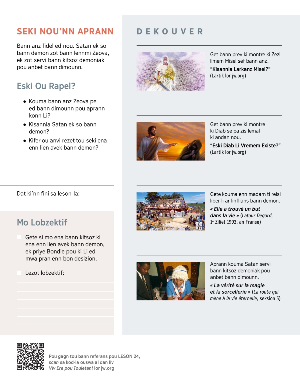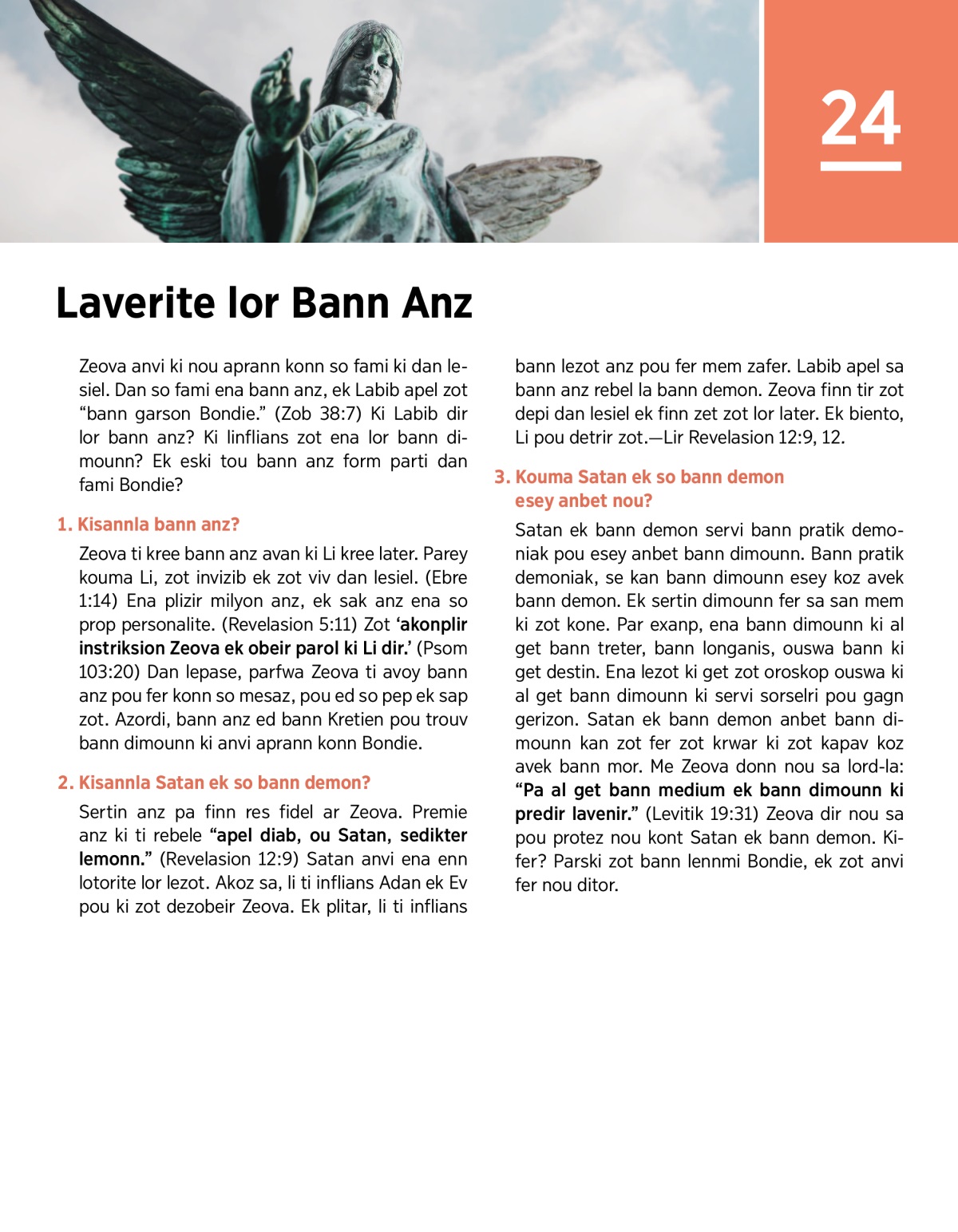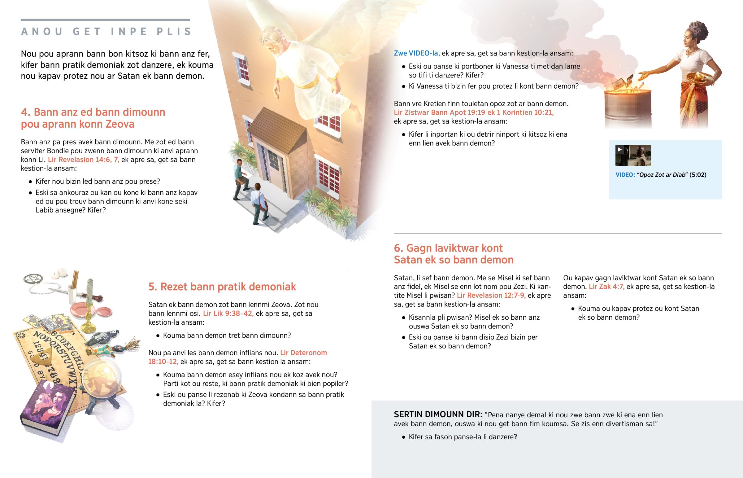 Nou pou aprann bann bon kitsoz ki bann anz fer, kifer bann pratik demoniak zot danzere, ek kouma nou kapav protez nou ar Satan ek bann demon.