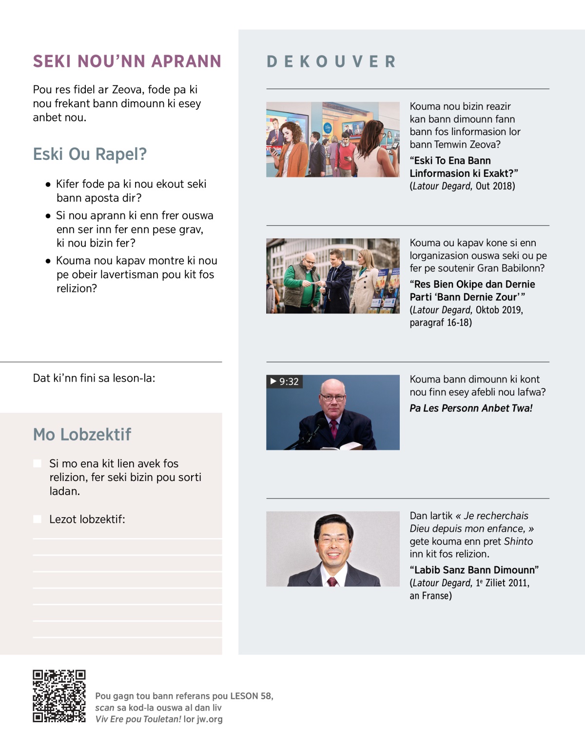 Nou lamour pou Zeova pou pous nou pou pa fer nanye ki ena enn lien avek fos relizion. Sa kapav konsern nou travay, ouswa lorganizasion dan ki nou ete, ouswa ninport ki laktivite ki nou fer. Zeova donn nou sa lavertisman-la: “Kit [Gran Babilonn], mo pep.”—Revelasion 18:2, 4.