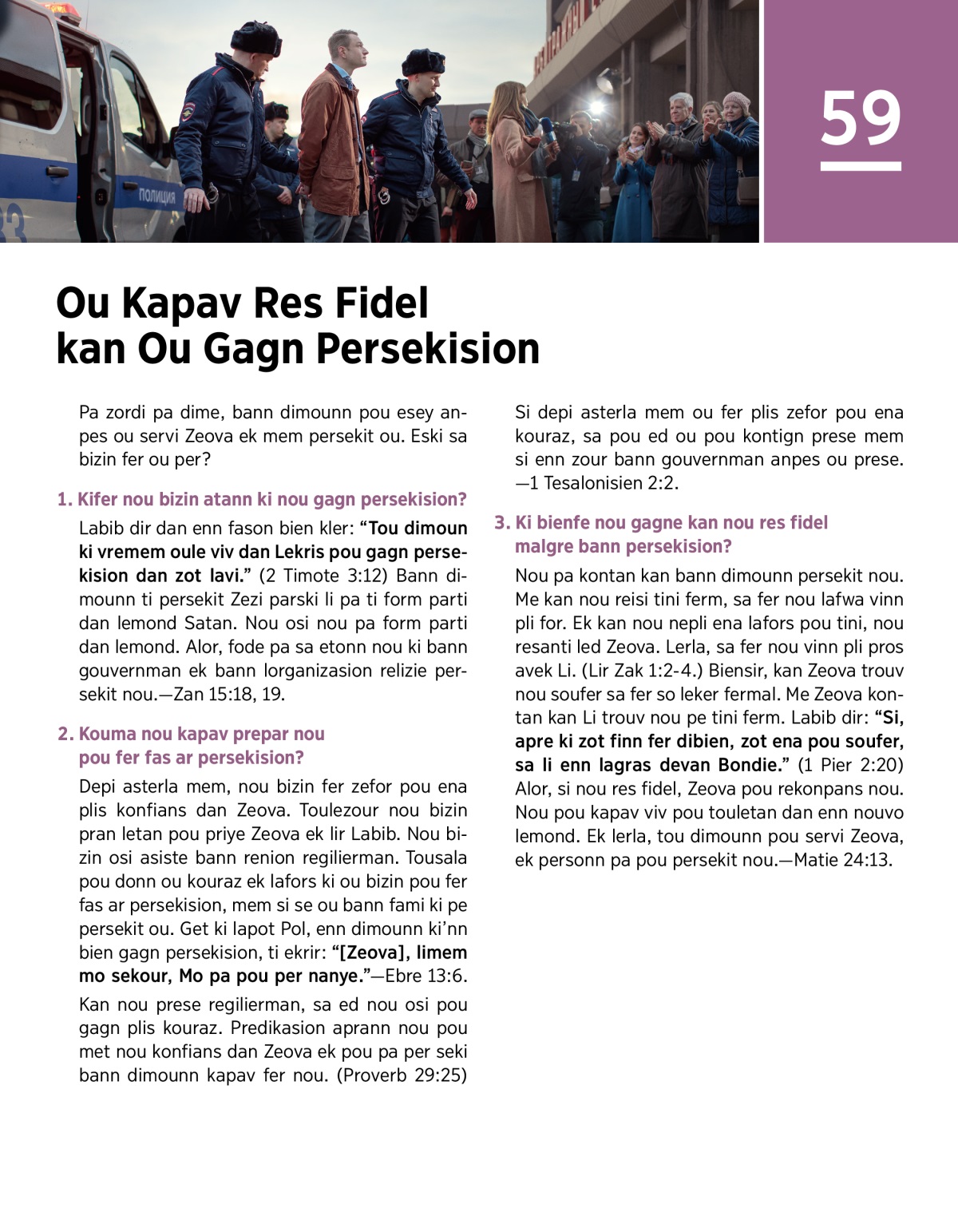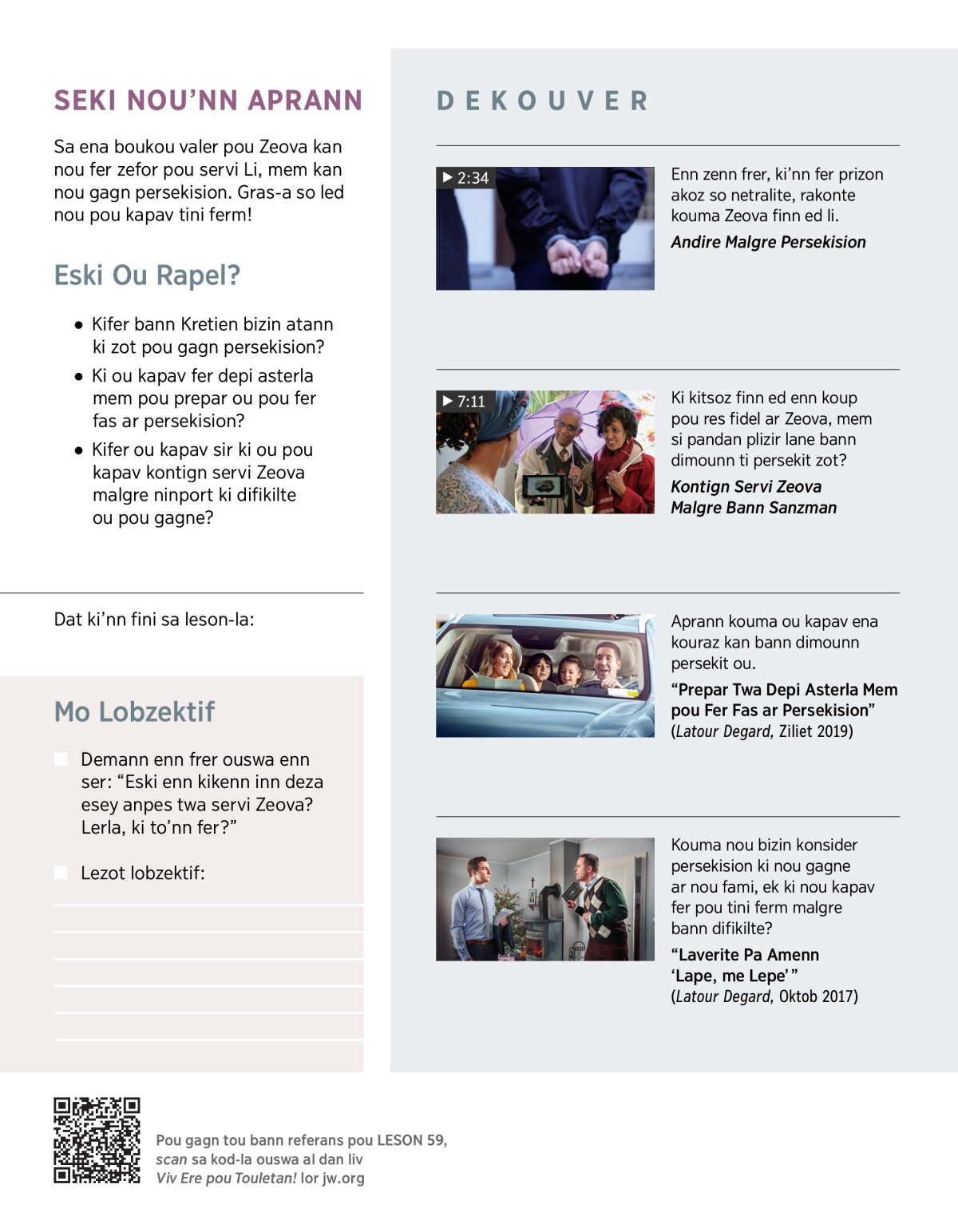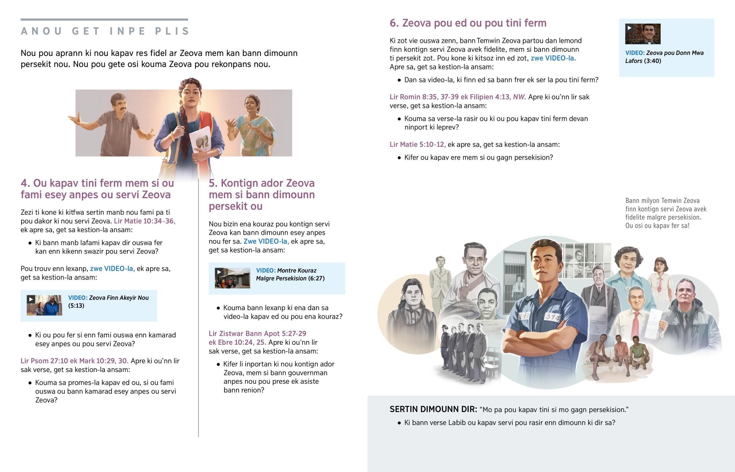 Ki zot vie ouswa zenn, bann Temwin Zeova partou dan lemond finn kontign servi Zeova avek fidelite, mem si bann dimounn ti persekit zot. Pou kone ki kitsoz inn ed zot, zwe VIDEO-la. Apre sa, get sa kestion-la ansam: