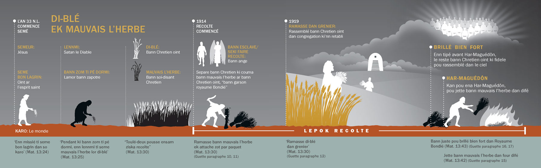 2 Bann l’evenement ki arrivé dan karo sa planteur-la montré couma ek kan Jésus ti pou rassemblé parmi l’humanité, tou seki represente di-blé, setadir bann Chretien oint ki pou regne avek li dan so Royaume. Ti commence seme bann lagrin di-blé jour la Pentecôte l’an 33 Nou Lepok. Rassemblement tou bann Chretien oint pou fini kan bann oint ki ankor lor later pendant lafin sa systeme-la pou scellé dan enn fason definitif ek lerla zot pou al dan le ciel. (Mat. 24:31; Rév. 7:1-4) Pareil couma enn dimoune ki la-haut lor enn montagne trouve tou seki autour li, alors sa parabole-la aide nou pou comprend pli bien bann l’evenement ki ti pou arrivé pendant enn periode apepré 2,000 an. Couma sa parabole-la faire nou comprend bann l’evenement ki arrivé en rapport avek Royaume Bondié? Sa parabole-la decrire enn lepok kot seme bann lagrin, bann lagrin-la poussé, ek recolté zot. Sa lartik-la pou mette l’accent surtout lor lepok recolte.a