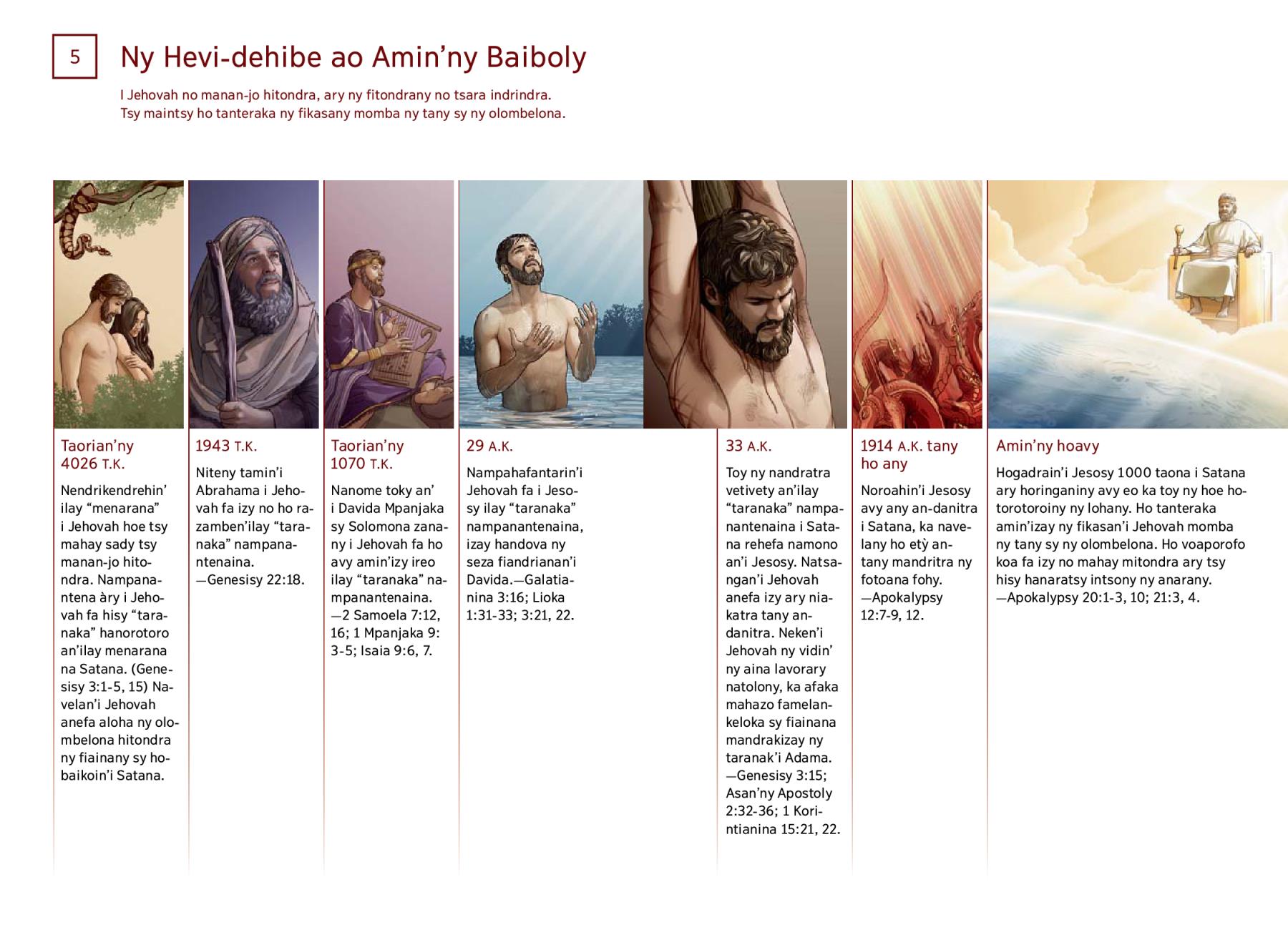 33 A.K. Toy ny nandratra vetivety an’ilay “taranaka” nampanantenaina i Satana rehefa namono an’i Jesosy. Natsangan’i Jehovah anefa izy ary niakatra tany an-danitra. Neken’i Jehovah ny vidin’ny aina lavorary natolony, ka afaka mahazo famelan-keloka sy fiainana mandrakizay ny taranak’i Adama.—Genesisy 3:15; Asan’ny Apostoly 2:32-36; 1 Korintianina 15:21, 22. |