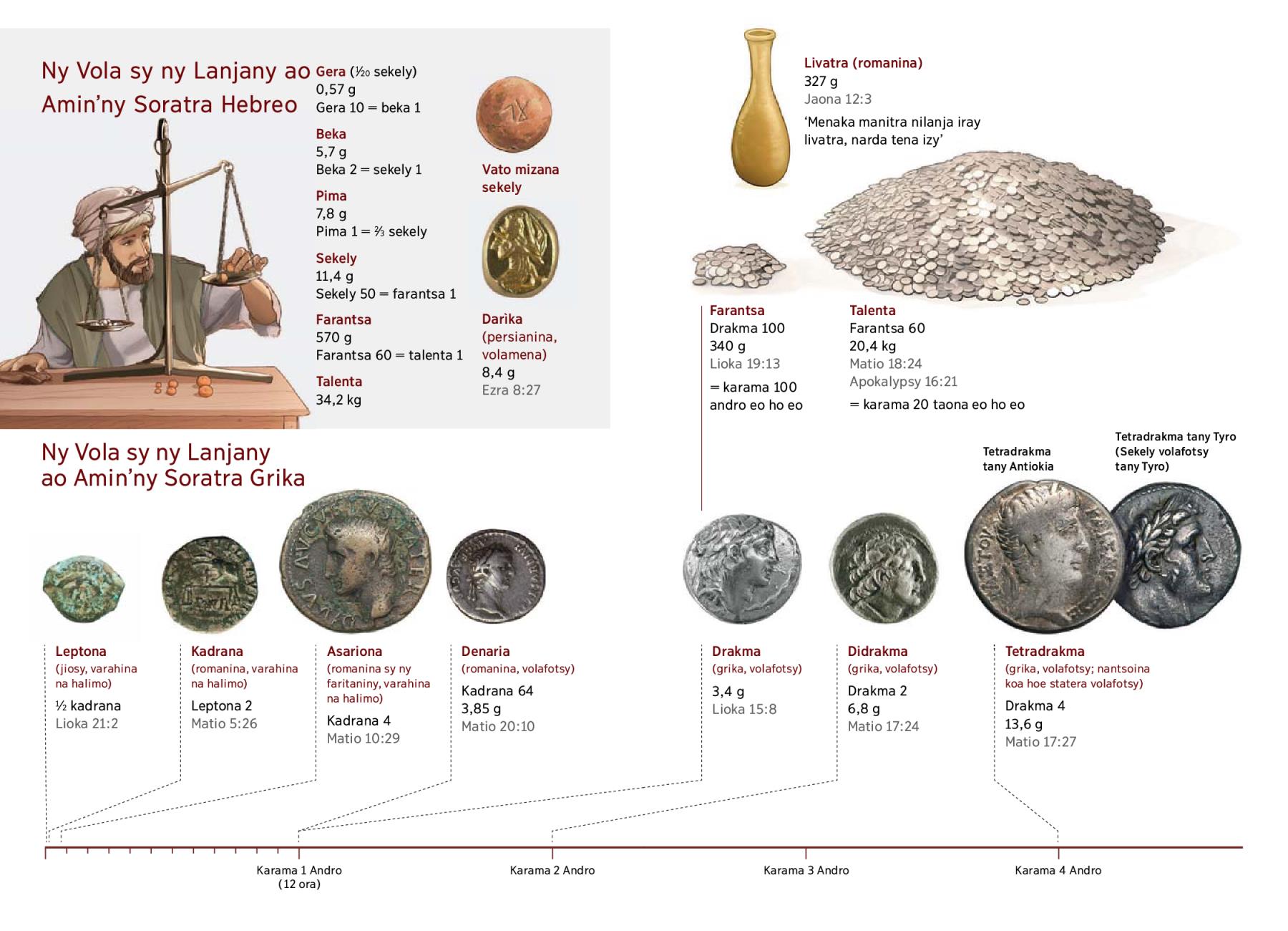 Tetradrakma tany Antiokia Tetradrakma tany Tyro (Sekely volafotsy tany Tyro) Tetradrakma (grika, volafotsy; nantsoina koa hoe statera volafotsy) Drakma 4 13,6 g = Karama 4 Andro |