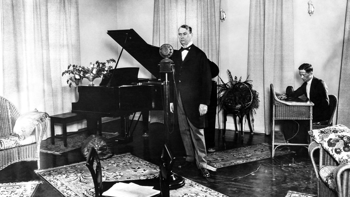 Џозеф Ратерфорд пред микрофон во студиото на WBBR. Во позадина е Виктор Шмит кој ја води првата емисија