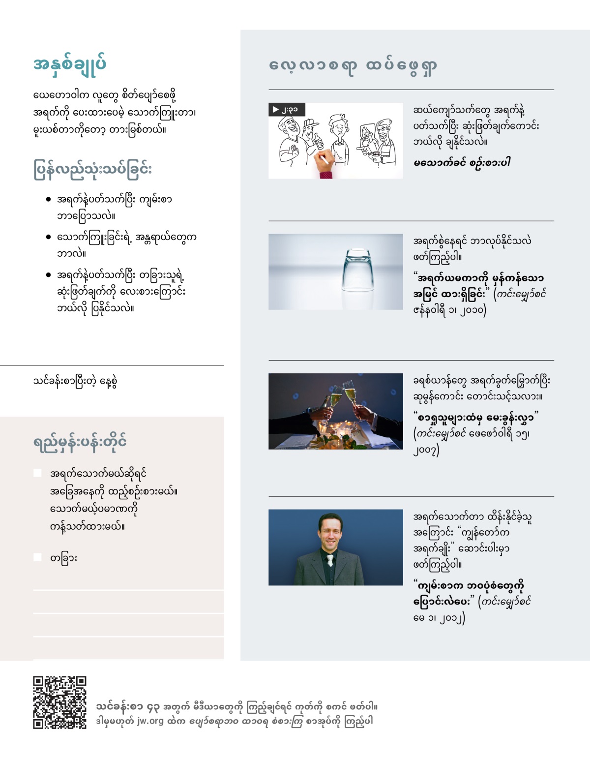 အရက်သောက်မလား၊ ဘယ်လောက်သောက်မလဲဆိုတာ ဆုံးဖြတ်ရာမှာ ကူညီပေးမယ့် ကျမ်းစာမူတွေကို သုံးသပ်ပါ။ အရက်သောက်တာကို ထိန်းဖို့ခက်နေရင် ဘာလုပ်နိုင်သလဲ ရှာဖွေပါ။
