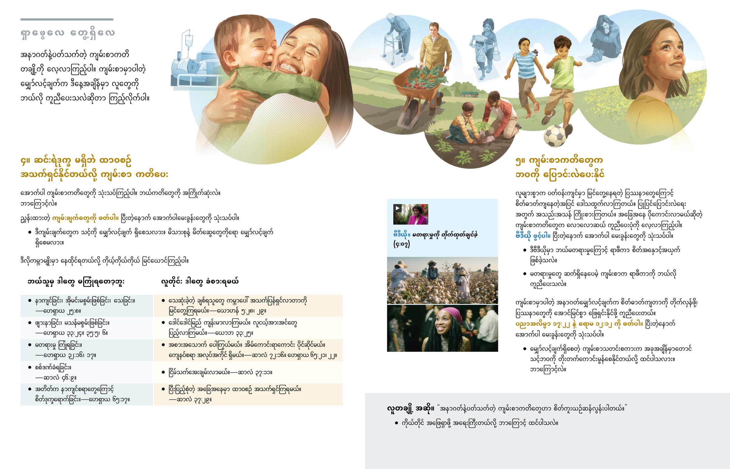 • ဒီကျမ်းချက်တွေက သင့်ကို မျှော်လင့်ချက် ရှိစေသလား။ မိသားစုနဲ့ မိတ်ဆွေတွေကိုရော မျှော်လင့်ချက် ရှိစေမလား။
