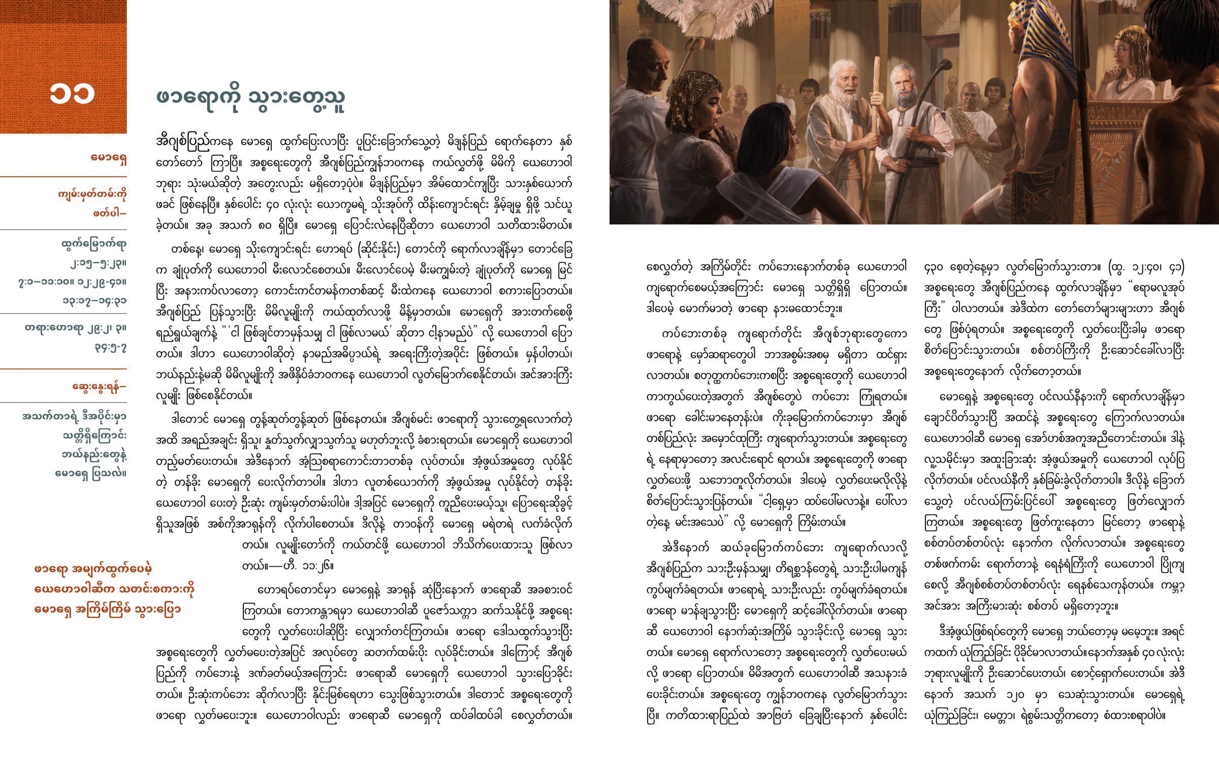 မောရှေ သတ္တိရှိရှိ တာဝန်ထမ်းဆောင်နိုင်ဖို့ အာရုန် ကူညီပေးသလို ညီအစ်ကို/မတွေကို ကျွန်တော်တို့ ဘယ်လို ကူညီပေးနိုင်သလဲ။ (ထွ. ၄:၁၄-၁၆) ရုပ်ပုံ ဂ