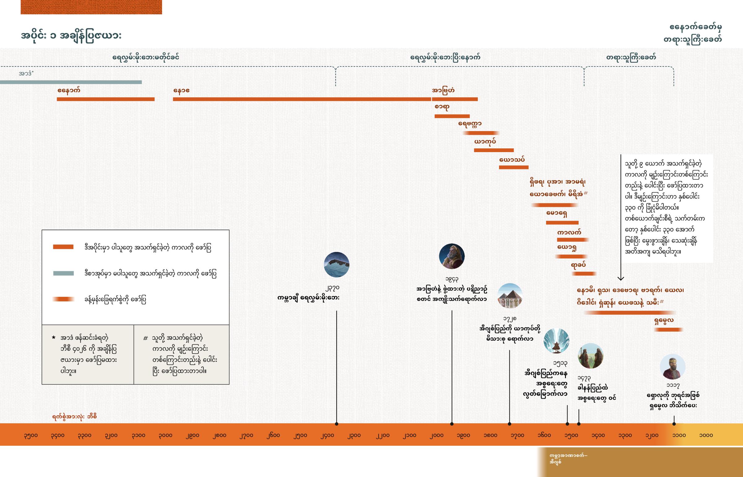 b သူတို့ ၉ ယောက် အသက်ရှင်ခဲ့တဲ့ ကာလကို မျဉ်းကြောင်းတစ်ကြောင်းတည်းနဲ့ ပေါင်းပြီး ဖော်ပြထားတာပါ။ ဒီမျဉ်းကြောင်းဟာ နှစ်ပေါင်း ၃၃၀ ကို ခြုံငုံမိပါတယ်။ တစ်ယောက်ချင်းစီရဲ့ သက်တမ်းကတော့ နှစ်ပေါင်း ၃၃၀ အောက် ဖြစ်ပြီး မွေးဖွားချိန်၊ သေဆုံးချိန် အတိအကျ မသိရပါဘူး။