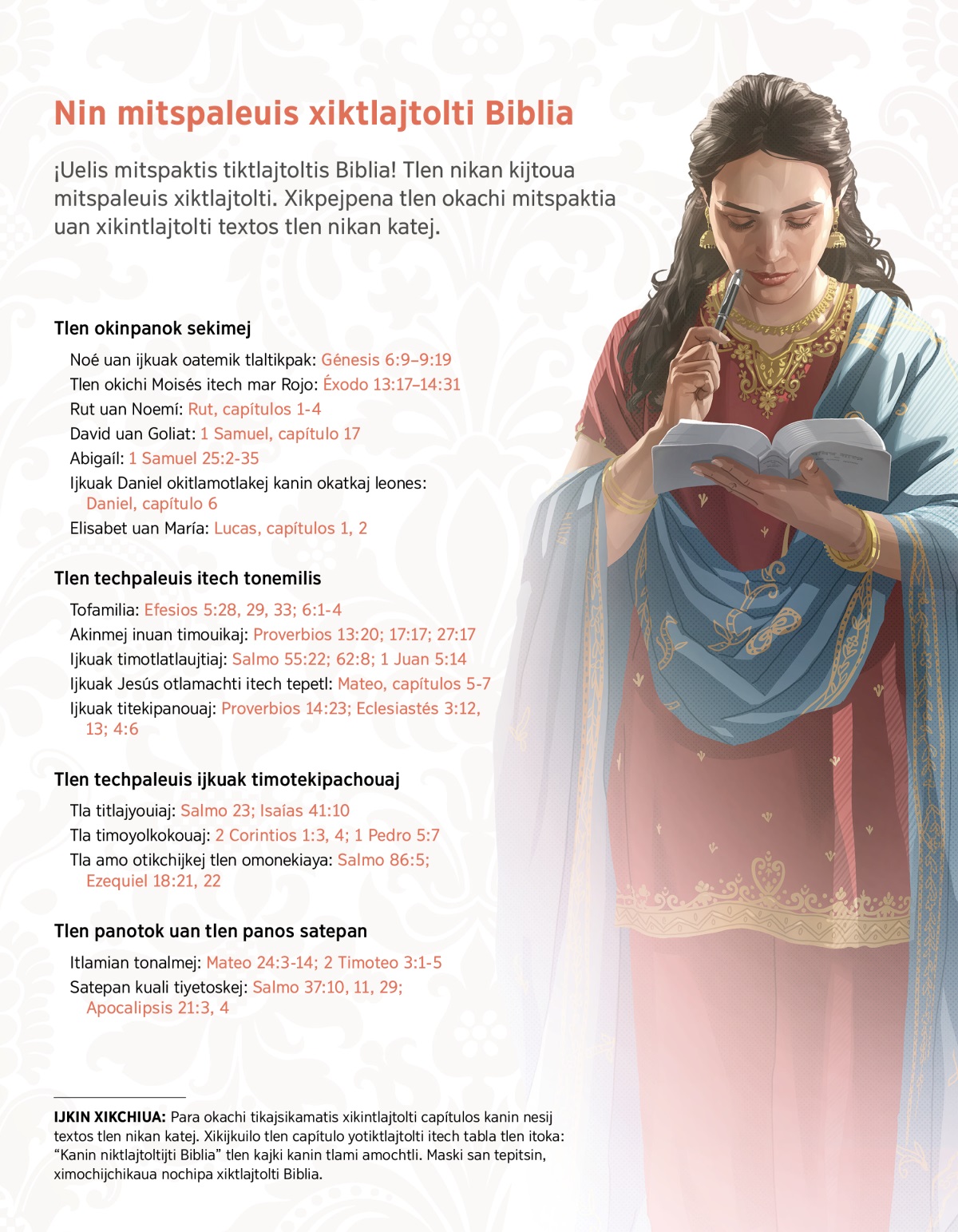 IJKIN XIKCHIUA: Para okachi tikajsikamatis xikintlajtolti capítulos kanin nesij textos tlen nikan katej. Xikijkuilo tlen capítulo yotiktlajtolti itech tabla tlen itoka: “Kanin niktlajtoltijti Biblia” tlen kajki kanin tlami amochtli. Maski san tepitsin, ximochijchikaua nochipa xiktlajtolti Biblia.