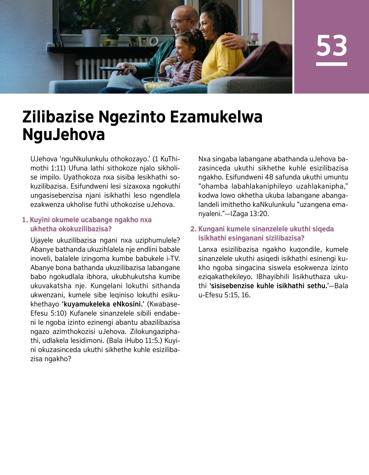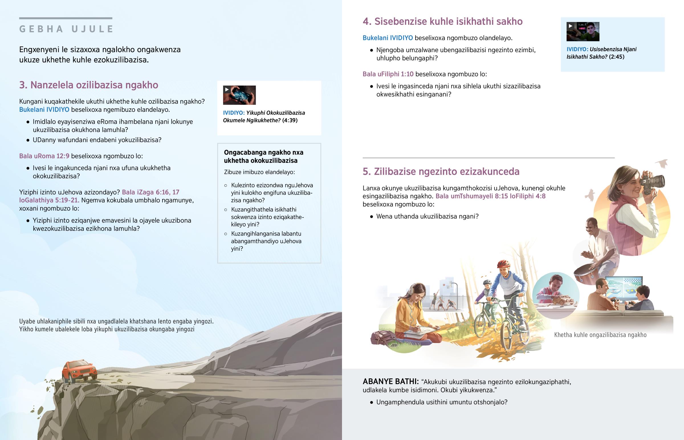 Ujayele ukuzilibazisa ngani nxa uziphumulele? Abanye bathanda ukuzihlalela nje endlini babale inoveli, balalele izingoma kumbe babukele i-TV. Abanye bona bathanda ukuzilibazisa labangane babo ngokudlala ibhora, ukubhukutsha kumbe ukuvakatsha nje. Kungelani lokuthi sithanda ukwenzani, kumele sibe leqiniso lokuthi esikukhethayo ‘kuyamukeleka eNkosini.’ (Kwabase-Efesu 5:10) Kufanele sinanzelele sibili endabeni le ngoba izinto ezinengi abantu abazilibazisa ngazo azimthokozisi uJehova. Zilokungaziphathi, udlakela lesidimoni. (Bala iHubo 11:5.) Kuyini okuzasinceda ukuthi sikhethe kuhle esizilibazisa ngakho?