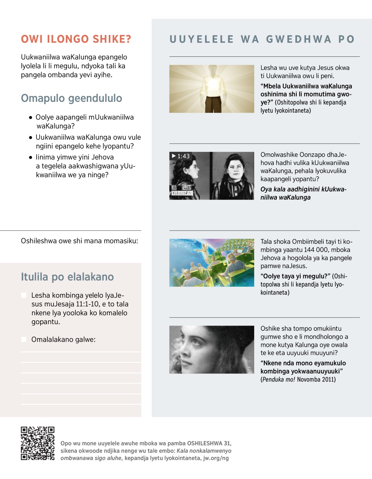 Etumwalaka lyUukwaniilwa waKalunga olyo lya simanenena mOmbiimbeli. Jehova ota ka longitha Uukwaniilwa mboka a ninge evi alihe Oparadisa. Uukwaniilwa waKalunga oshike? Otu shi shi ngiini kutya otawu pangele ngashingeyi? Owa tompola po nale shike, notawu ka gwanitha po shike monakuyiwa? Oshileshwa shika noshi-32 sigo oshi-33, otayi yamukula omapulo ngoka.