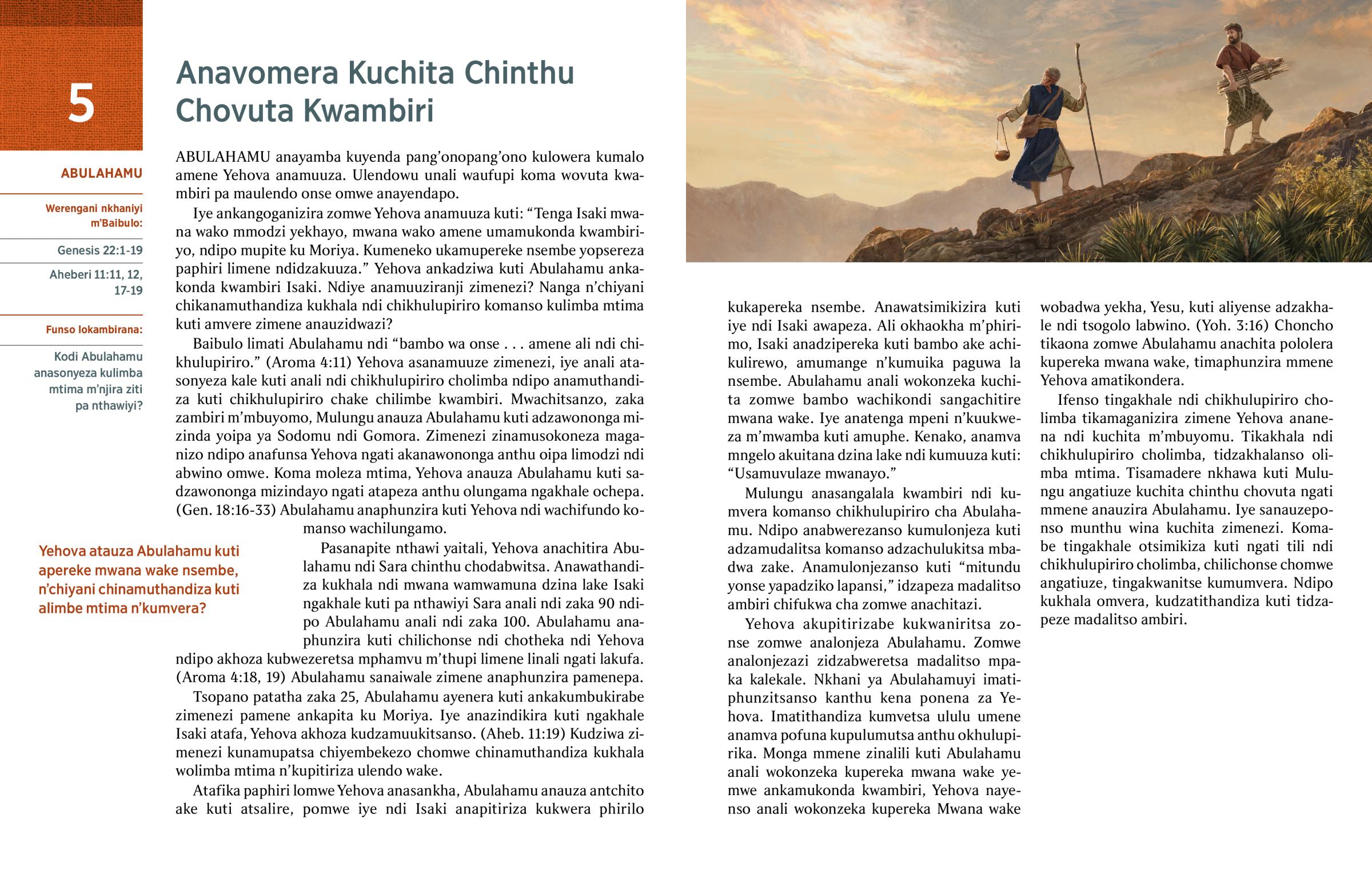 Abulahamu ndi Isaki akuyenda m’phiri. Abulahamu wanyamula m’phika wamakala amoto. Ndipo Isaki wanyamula mtolo wa nkhuni. Isaki watembenuka, akuyang’ana bambo ake omwe akuyang’anitsitsa kumwamba.