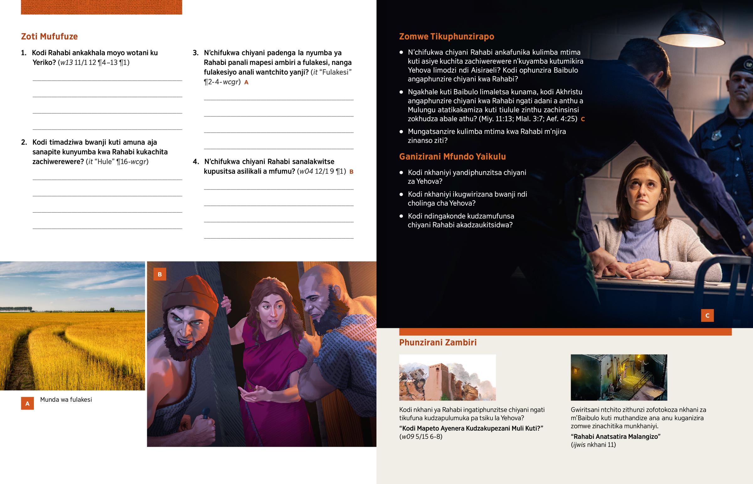 • Ngakhale kuti Baibulo limaletsa kunama, kodi Akhristu angaphunzire chiyani kwa Rahabi ngati adani a anthu a Mulungu atatikakamiza kuti tiulule zinthu zachinsinsi zokhudza abale athu? (Miy. 11:13; Mlal. 3:7; Aef. 4:25) C