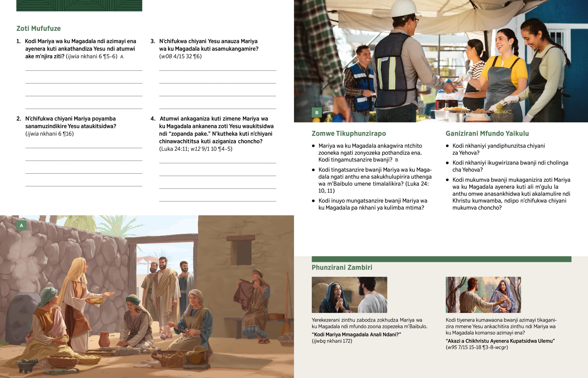 • Mariya wa ku Magadala ankagwira ntchito zooneka ngati zonyozeka pothandiza ena. Kodi tingamutsanzire bwanji? B