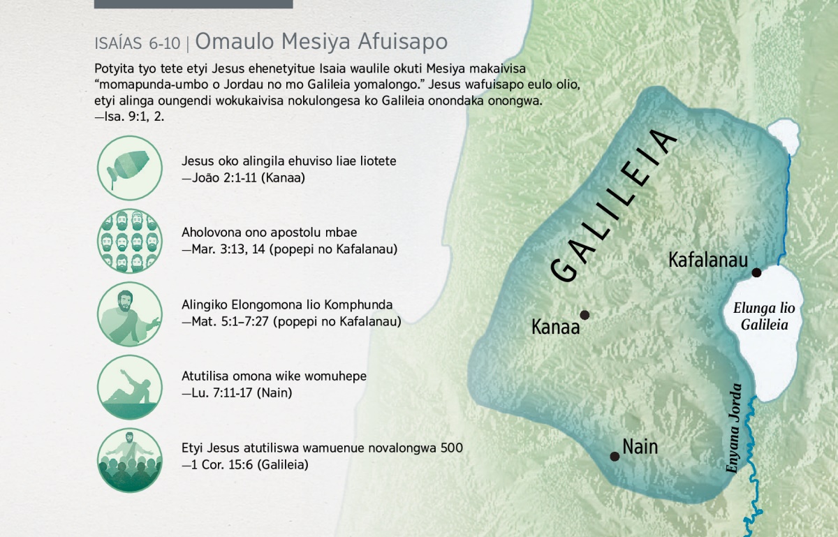 Potyita tyo tete etyi Jesus ehenetyitue Isaia waulile okuti Mesiya makaivisa “momapunda-umbo o Jordau no mo Galileia yomalongo.” Jesus wafuisapo eulo olio, etyi alinga oungendi wokukaivisa nokulongesa ko Galileia onondaka onongwa.—Isa. 9:1, 2.