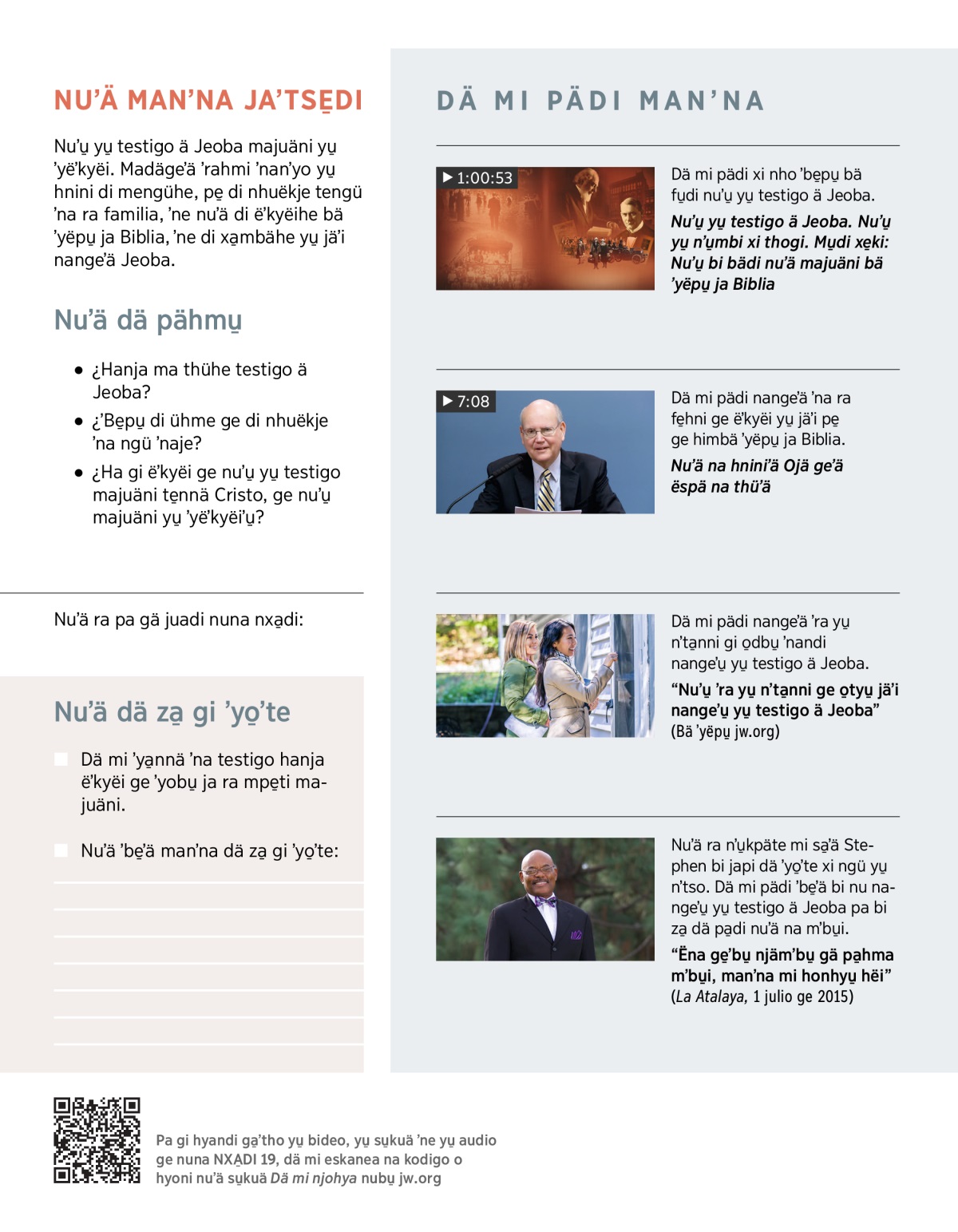 “Nuʼu̱ ʼra yu̱ nʼta̱nni ge o̱tyu̱ jäʼi nangeʼu̱ yu̱ testigo ä Jeoba” (Bä ʼyëpu̱ jw.org)