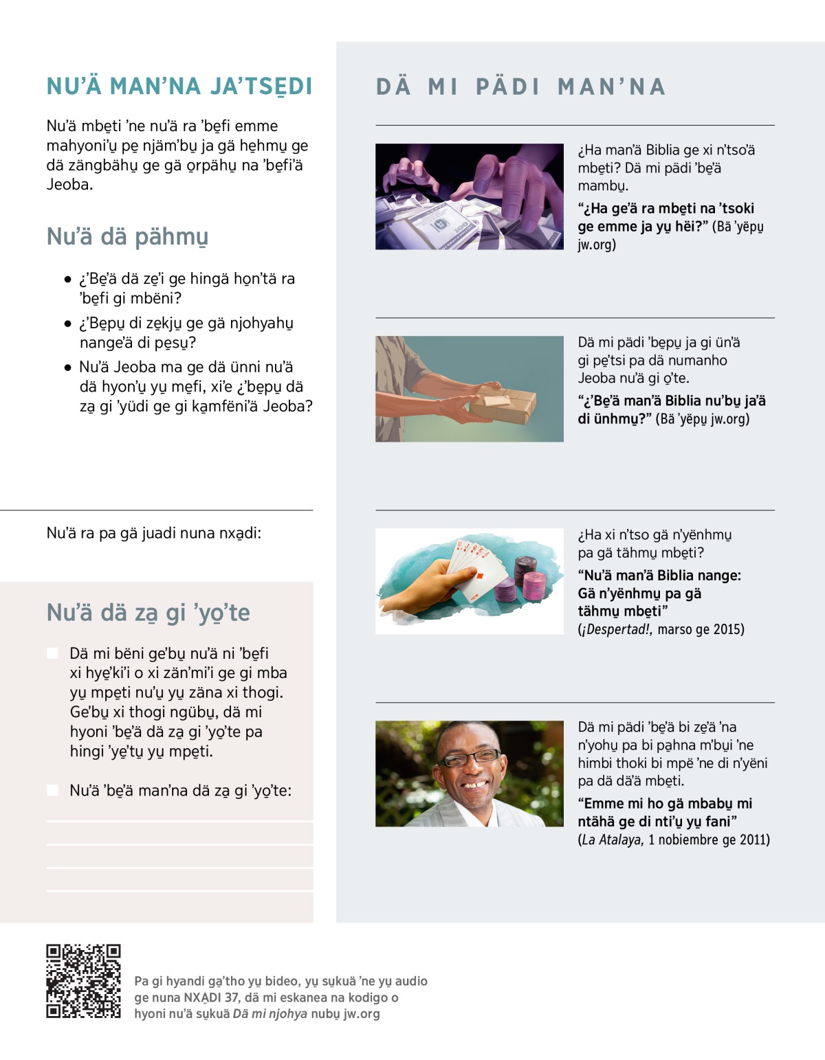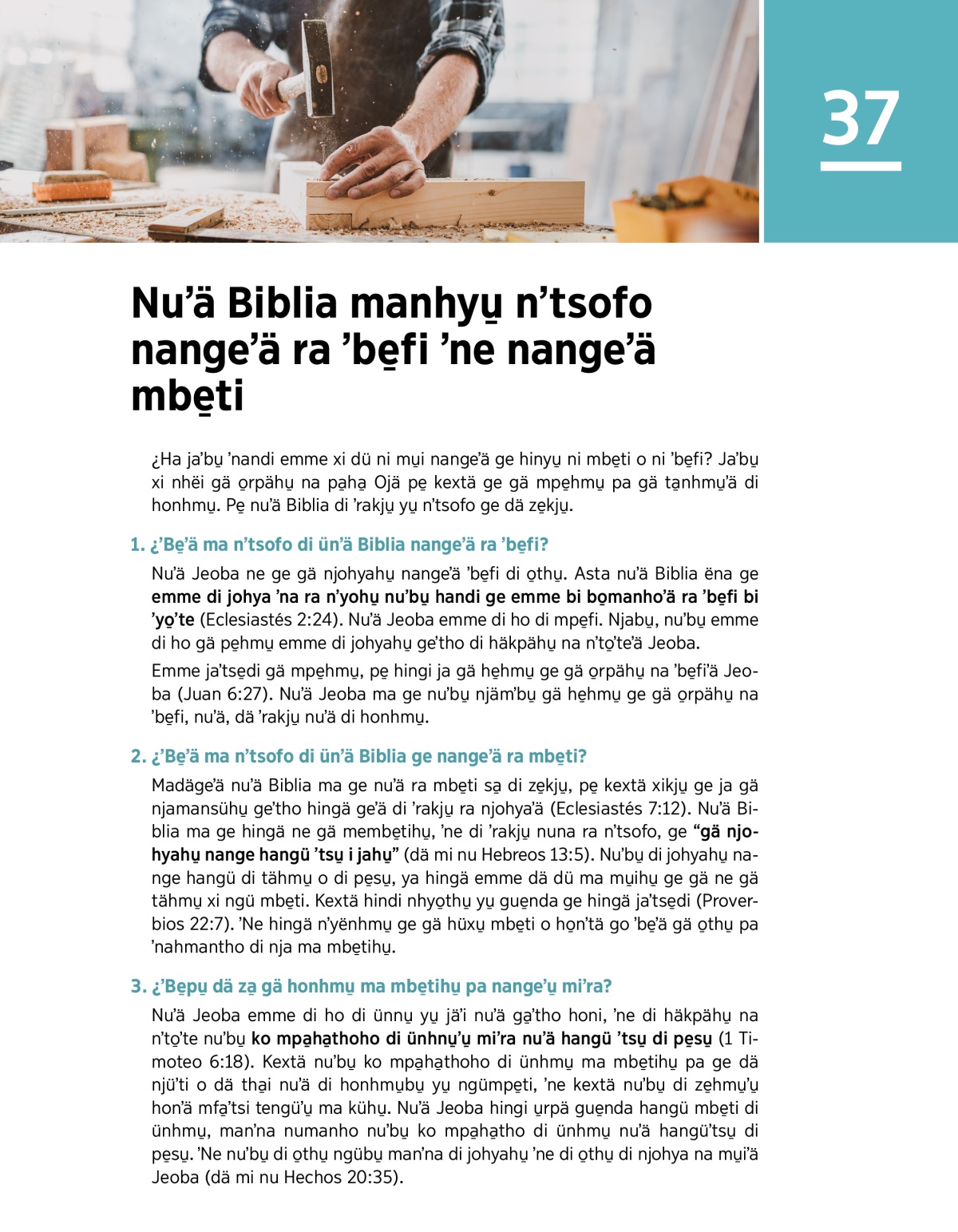 Madägeʼä nuʼä Biblia ma ge nuʼä ra mbe̱ti sa̱ di ze̱kju̱, pe̱ kextä xikju̱ ge ja gä njamansühu̱ geʼtho hingä geʼä di ʼrakju̱ ra njohyaʼä (Eclesiastés 7:12). Nuʼä Biblia ma ge hingä ne gä membe̱tihu̱, ʼne di ʼrakju̱ nuna ra nʼtsofo, ge “gä njohyahu̱ nange hangü ʼtsu̱ i jahu̱” (dä mi nu Hebreos 13:5). Nuʼbu̱ di johyahu̱ nange hangü di tähmu̱ o di pe̱su̱, ya hingä emme dä dü ma mu̱ihu̱ ge gä ne gä tähmu̱ xi ngü mbe̱ti. Kextä hindi nhyo̱thu̱ yu̱ gue̱nda ge hingä jaʼtse̱di (Proverbios 22:7). ʼNe hingä nʼyënhmu̱ ge gä hüxu̱ mbe̱ti o ho̱nʼtä go ʼbe̱ʼä gä o̱thu̱ pa ʼnahmantho di nja ma mbe̱tihu̱.