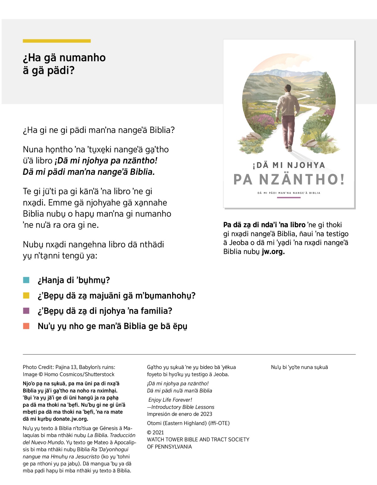 Nuna ho̱ntho ʼna ʼtu̱xe̱ki nangeʼä ga̱ʼtho üʼä libro ¡Dä mi njohya pa nzäntho! Dä mi pädi manʼna nangeʼä Biblia.
