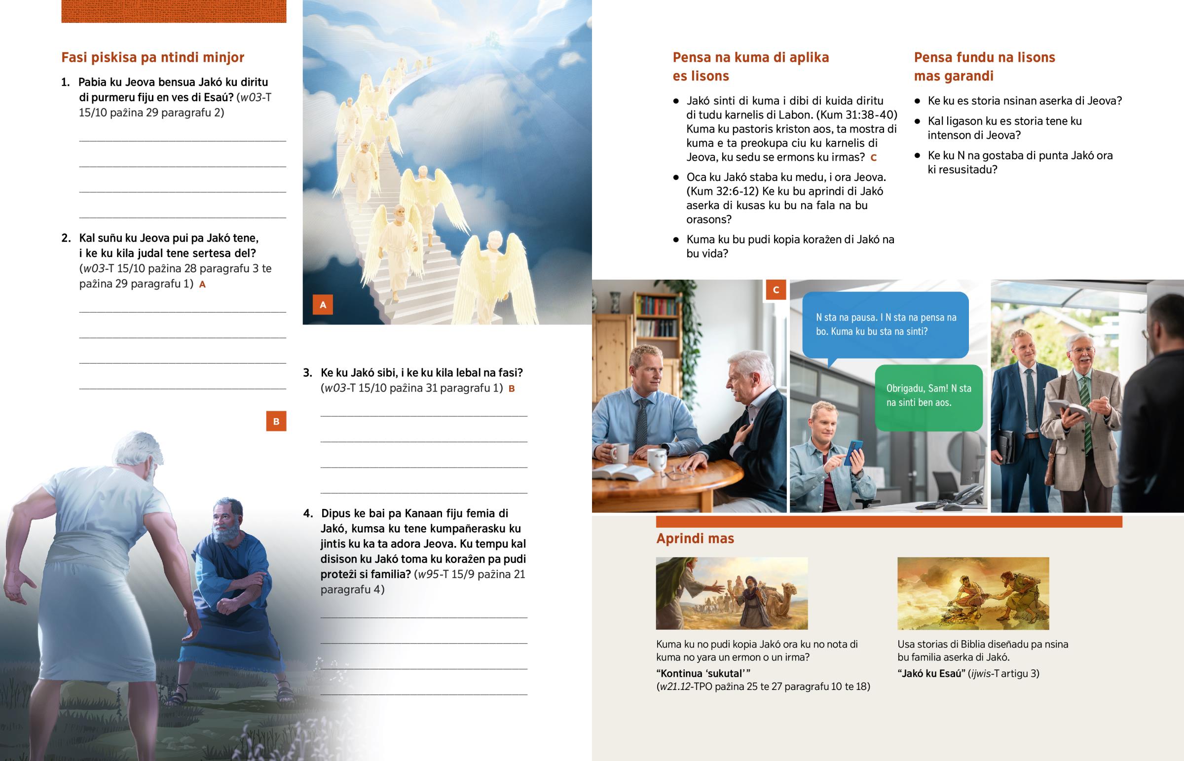 • Jakó sinti di kuma i dibi di kuida diritu di tudu karnelis di Labon. (Kum 31:​38-40) Kuma ku pastoris kriston aos, ta mostra di kuma e ta preokupa ciu ku karnelis di Jeova, ku sedu se ermons ku irmas? C
