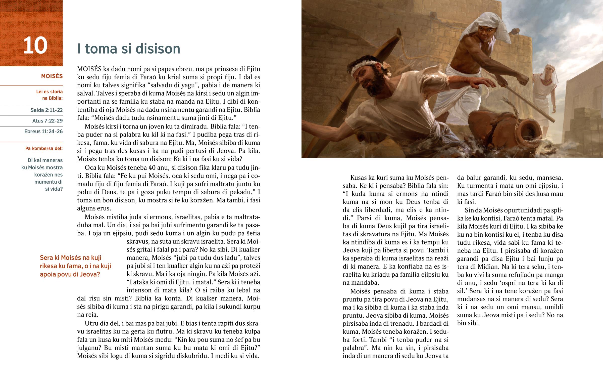 Moisés pensaba di kuma i staba pruntu pa tira povu di Jeova na Ejitu, ma i ka sibiba di kuma i ka staba inda pruntu. Jeova sibiba di kuma, Moisés pirsisaba inda di trenadu. I bardadi di kuma, Moisés teneba koraẑen. I seduba forti. Tambi “i tenba puder na si palabra”. Ma nin ku sin, i pirsisaba inda di un manera di sedu ku Jeova ta da balur garandi, ku sedu, mansesa. Ku turmenta i mata un omi ejipsiu, i mas tardi Faraó bin sibi des kusa mau ki fasi.