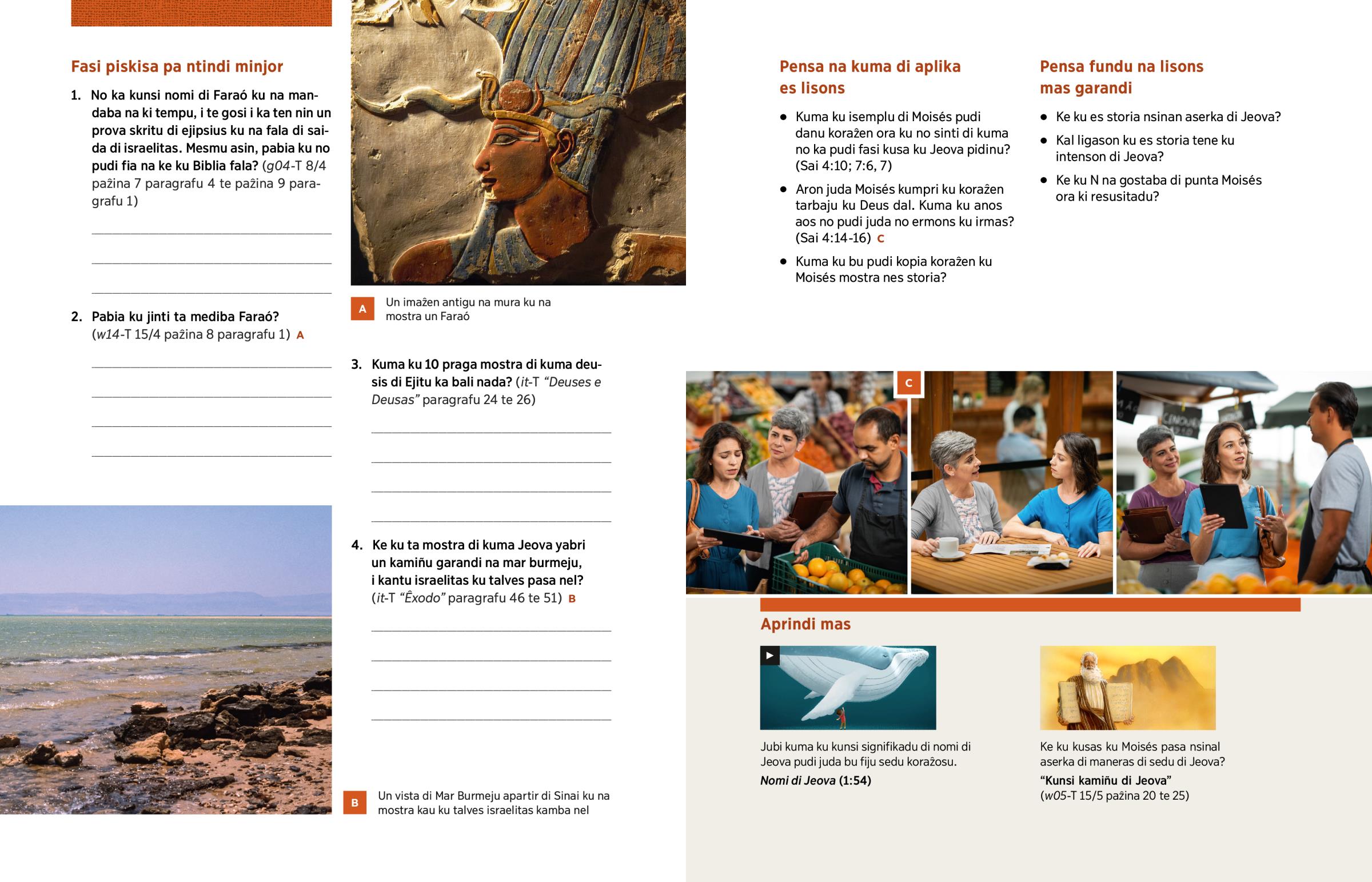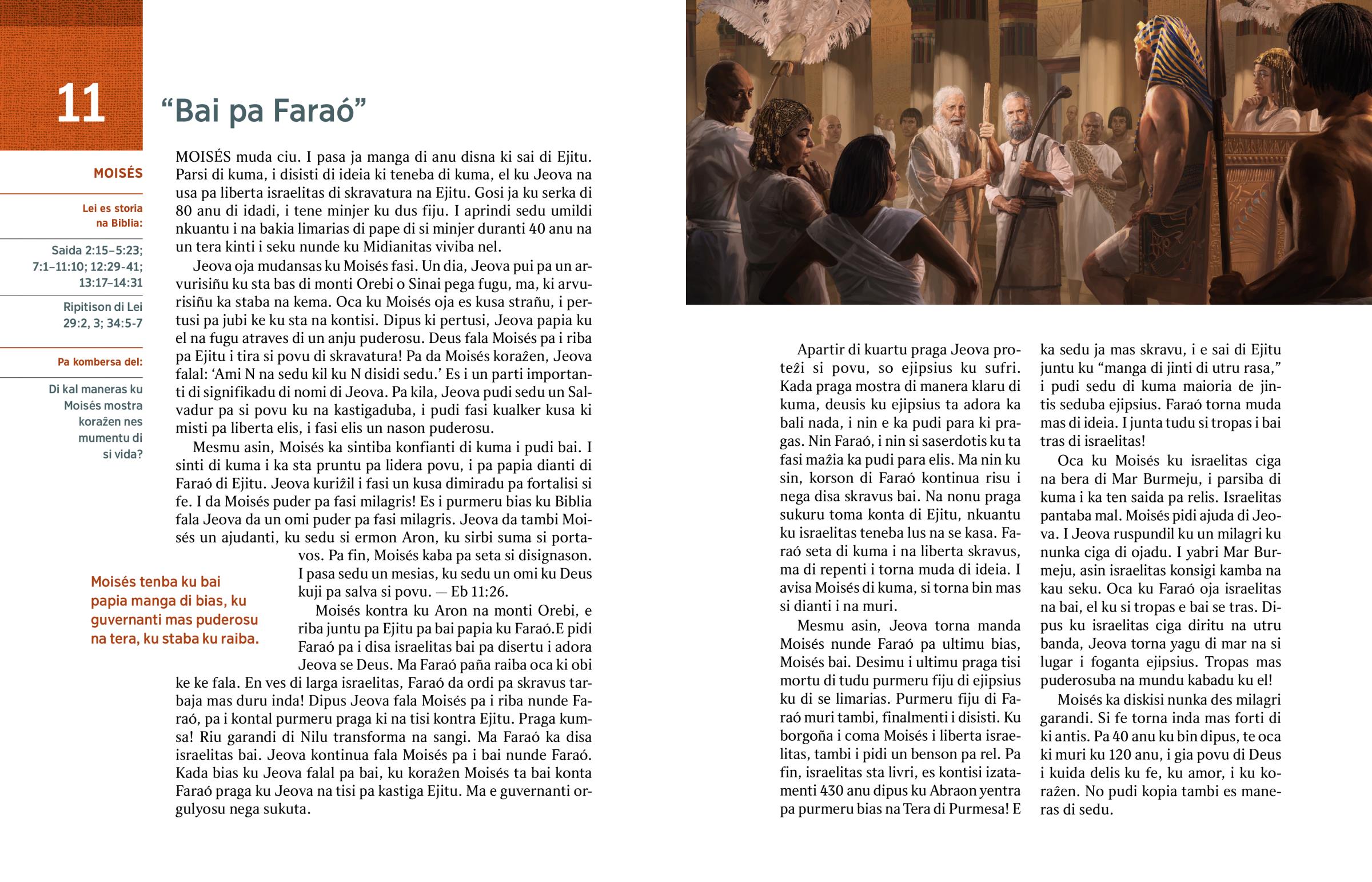MOISÉS muda ciu. I pasa ja manga di anu disna ki sai di Ejitu. Parsi di kuma, i disisti di ideia ki teneba di kuma, el ku Jeova na usa pa liberta israelitas di skravatura na Ejitu. Gosi ja ku serka di 80 anu di idadi, i tene minjer ku dus fiju. I aprindi sedu umildi nkuantu i na bakia limarias di pape di si minjer duranti 40 anu na un tera kinti i seku nunde ku Midianitas viviba nel.