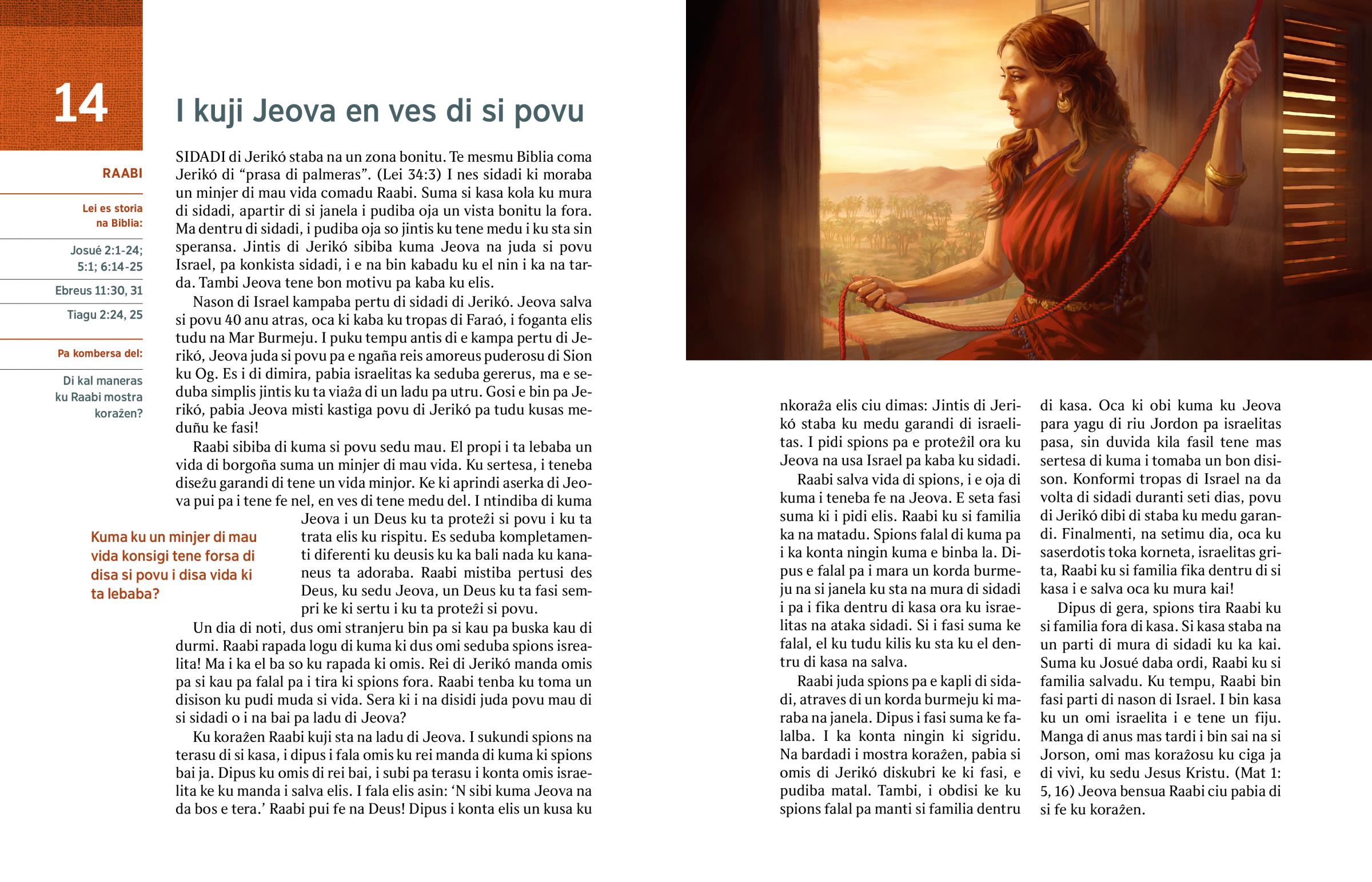 Raabi juda spions pa e kapli di sidadi, atraves di un korda burmeju ki maraba na janela. Dipus i fasi suma ke falalba. I ka konta ningin ki sigridu. Na bardadi i mostra koraẑen, pabia si omis di Jerikó diskubri ke ki fasi, e pudiba matal. Tambi, i obdisi ke ku spions falal pa manti si familia dentru di kasa. Oca ki obi kuma ku Jeova para yagu di riu Jordon pa israelitas pasa, sin duvida kila fasil tene mas sertesa di kuma i tomaba un bon disison. Konformi tropas di Israel na da volta di sidadi duranti seti dias, povu di Jerikó dibi di staba ku medu garandi. Finalmenti, na setimu dia, oca ku saserdotis toka korneta, israelitas grita, Raabi ku si familia fika dentru di si kasa i e salva oca ku mura kai!